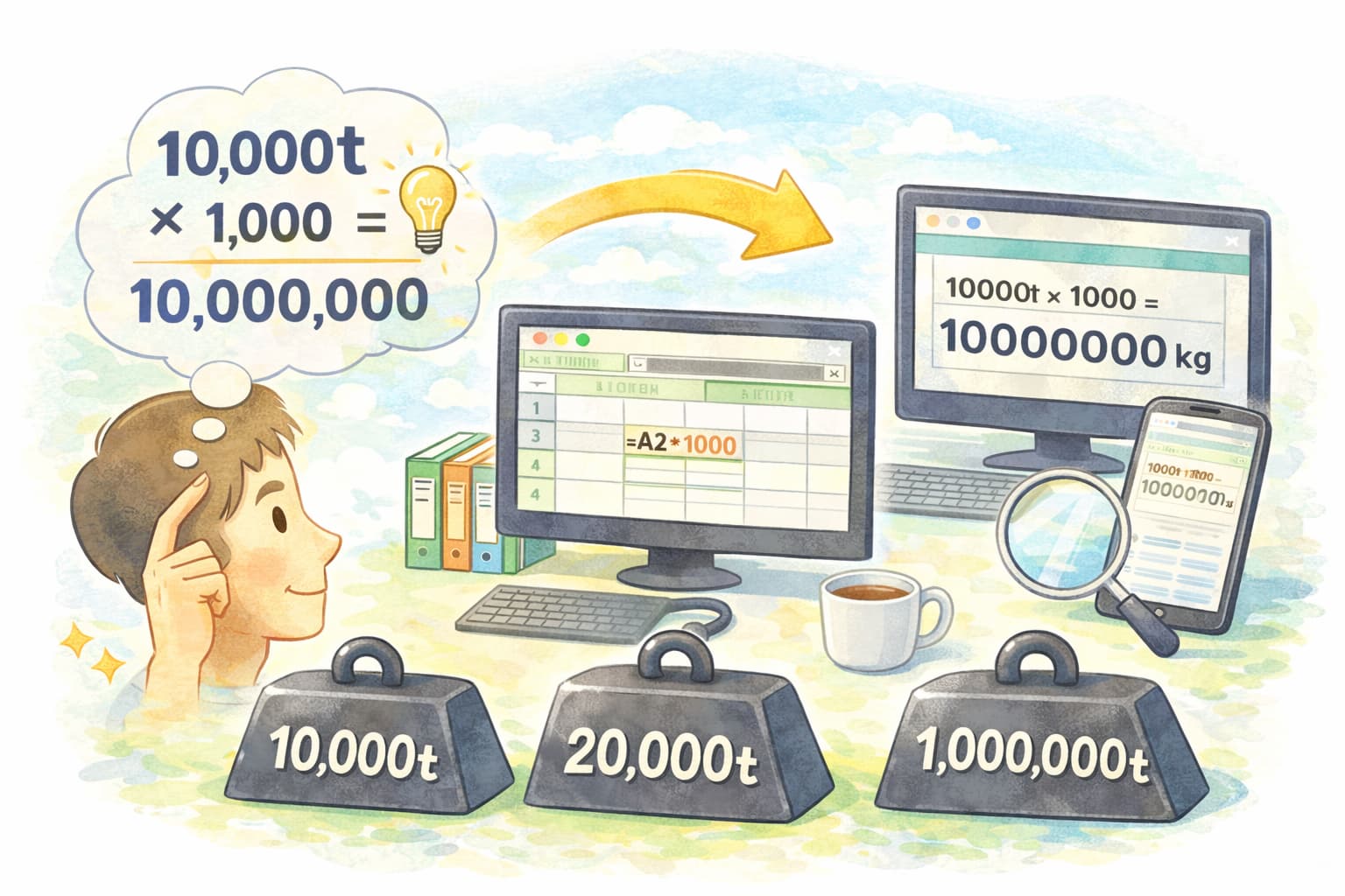 エクセルでは「=セル×1000」という非常にシンプルな式で、トンからkgへの換算が可能です。