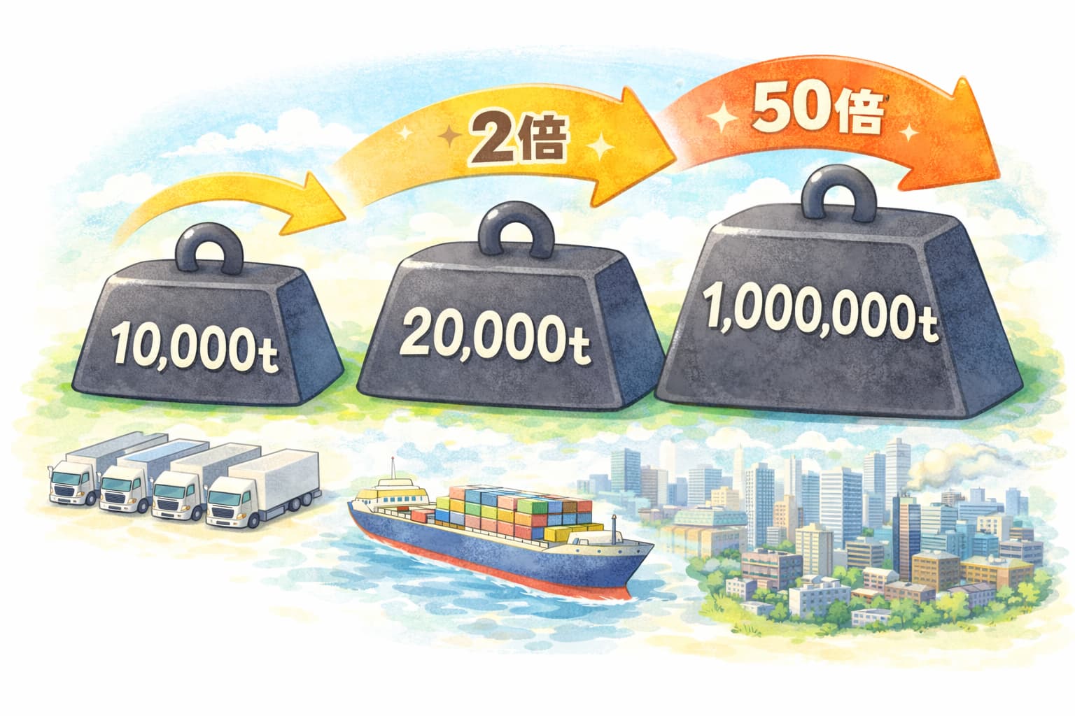 1万トンが「大規模な物流単位」だとすれば、100万トンは「社会インフラや国家戦略に関わる単位」と言えます。