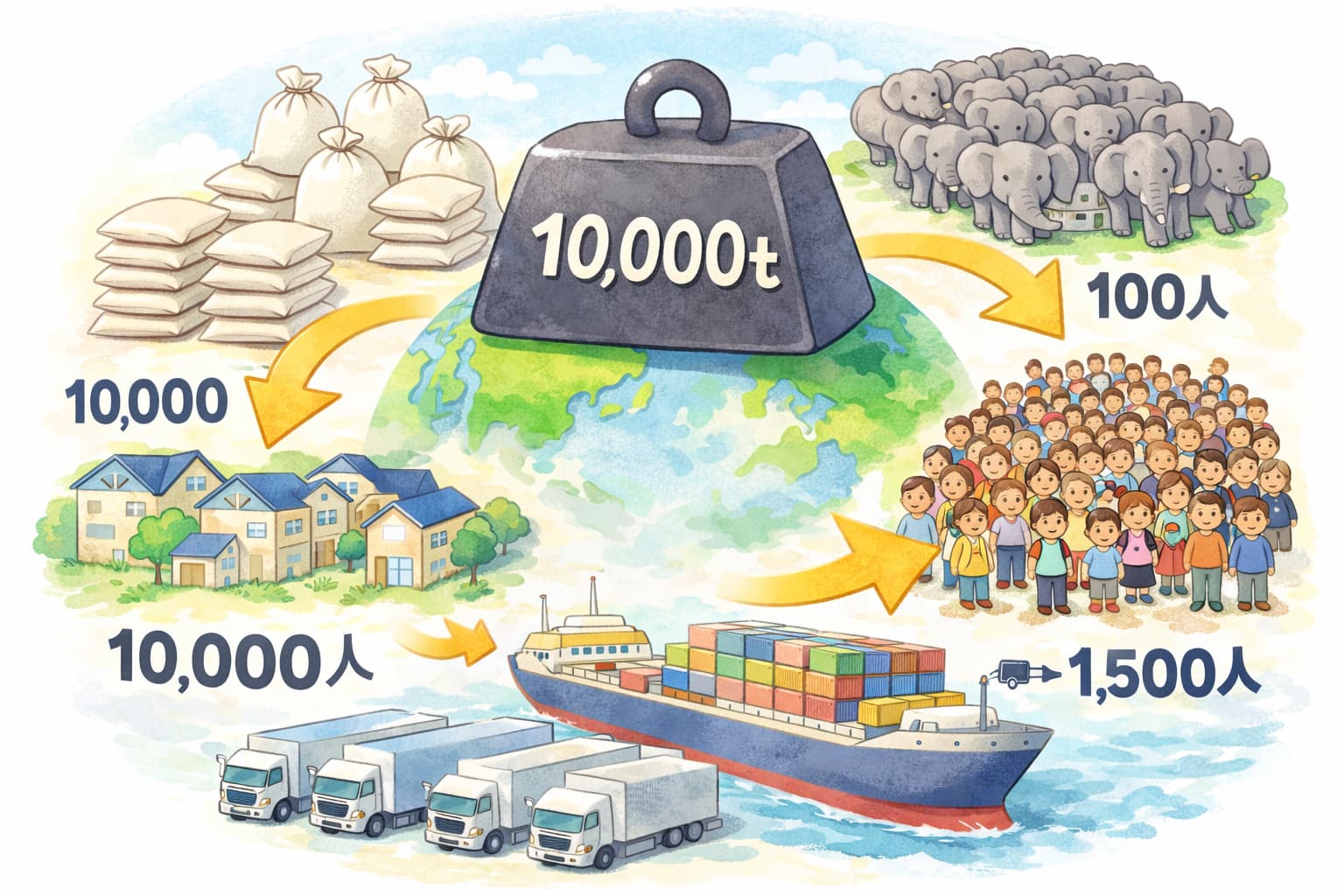 スーパーや家庭で扱う単位とは桁がまったく異なるため、「日常感覚では捉えきれない重さ」であることが実感できます。