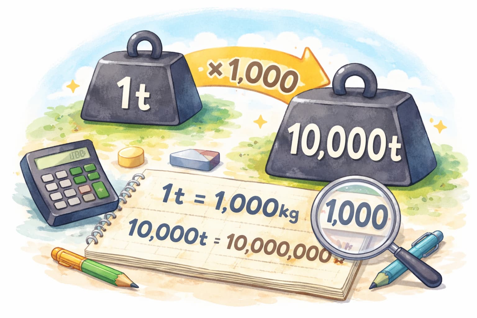 1万トンの計算を素早く行うには、「1トン=1,000kg」という関係を頭に置いたまま、「1万=10,000」という数字をそのまま掛けるイメージを持つと便利です。