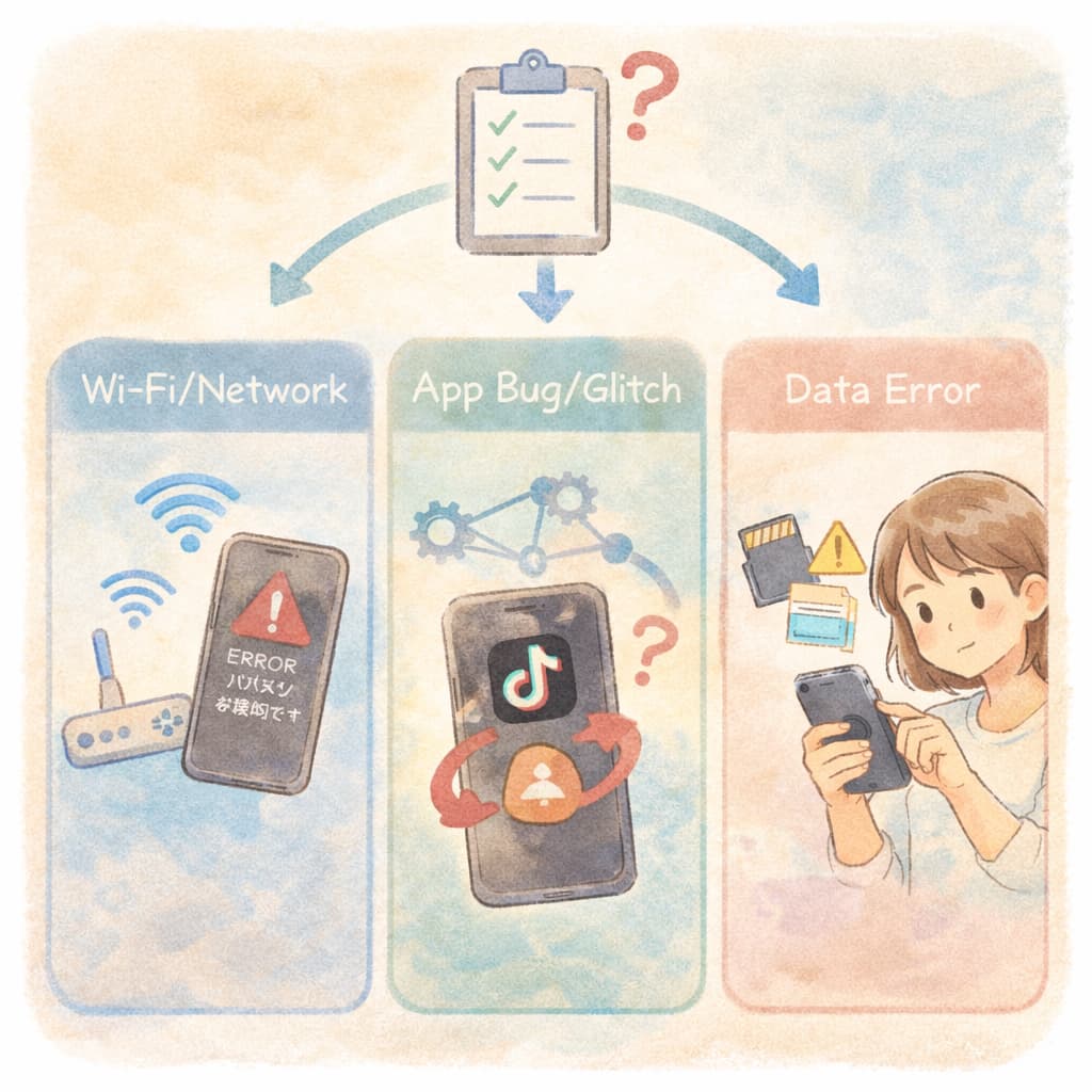 加えて、端末情報(iPhone/Android機種名)、OSバージョン、TikTokアプリのバージョン、通信環境(Wi-Fi/モバイル)、発生日時を整理します。