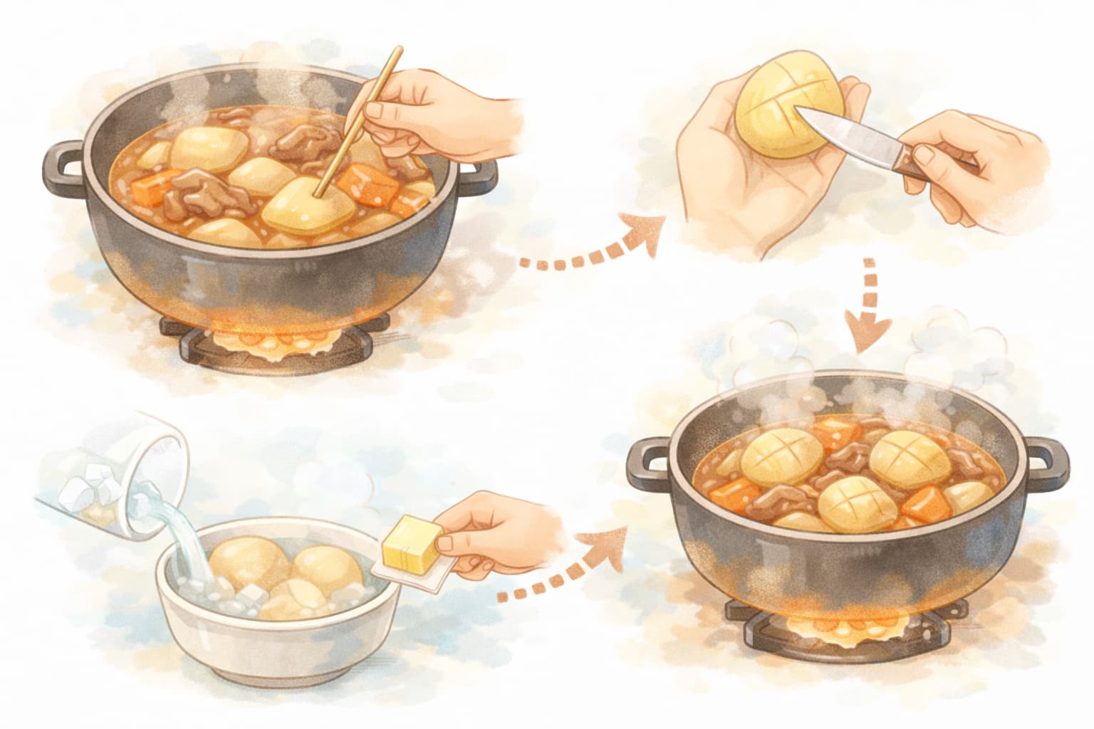 特にじゃがいもはデンプン質が多く、火の通り方によって味の入り方が大きく変わります