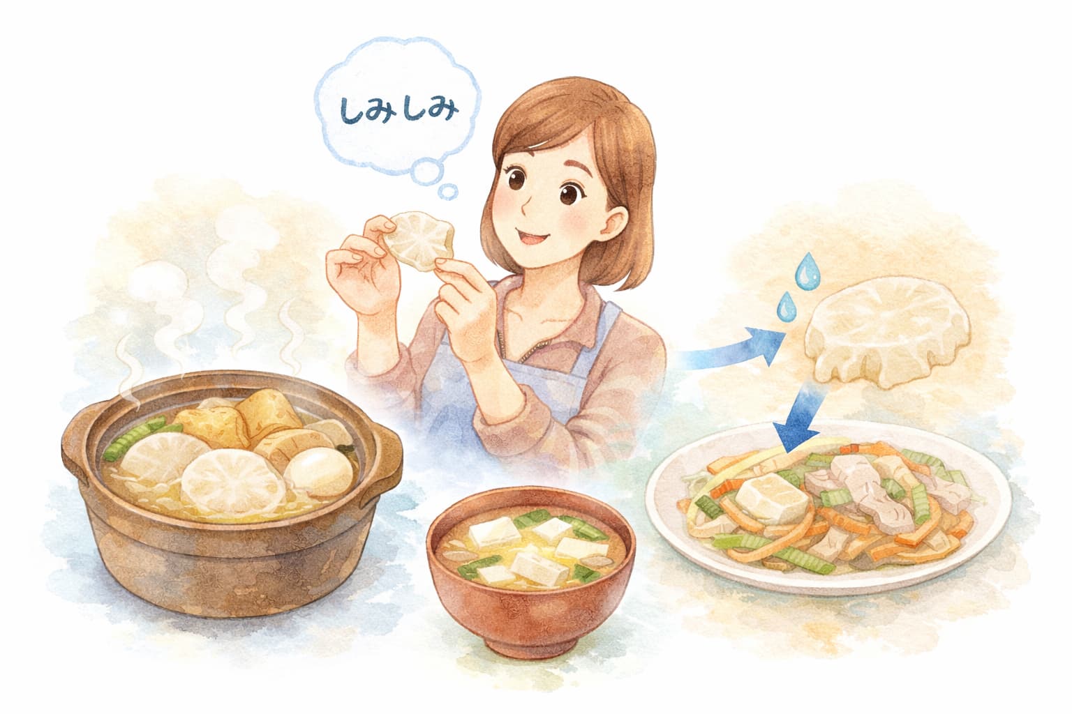 下味をつけてから軽く煮含めると、水分とともに味が戻り、口当たりが整いやすくなります。