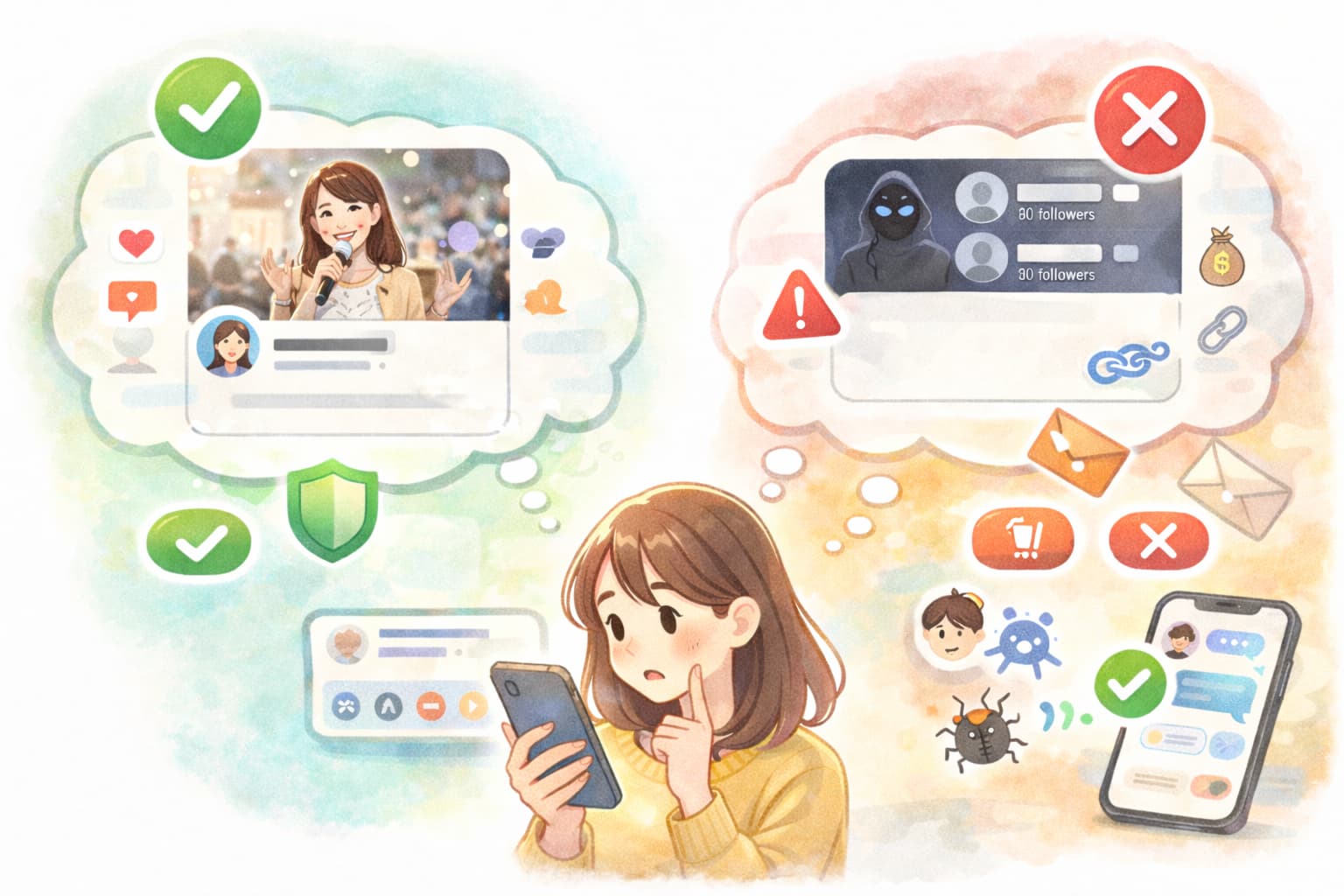 本物の芸能人や企業公式アカウントが、初回DMで外部サービスへ直接誘導することはほとんどありません。