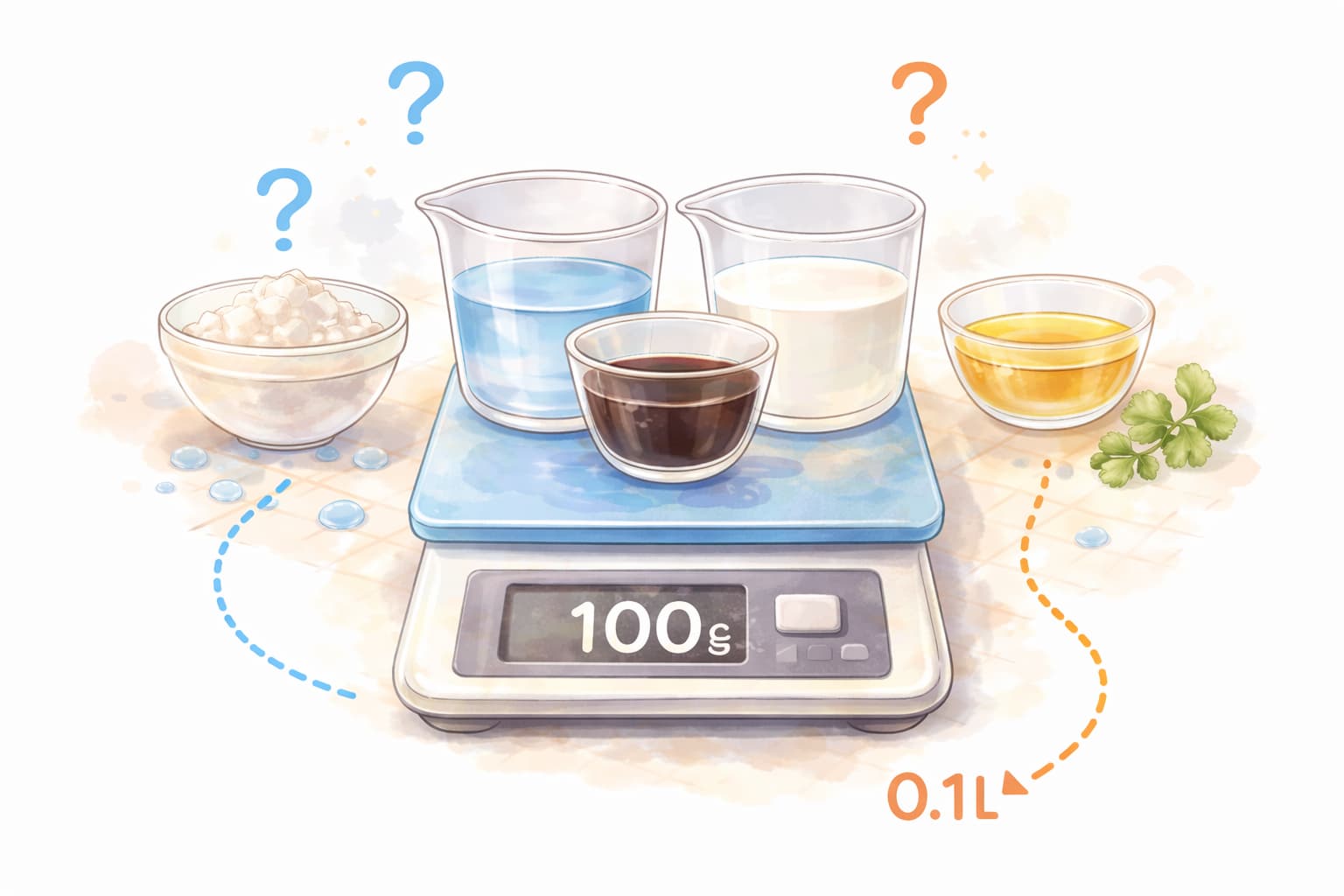 水やだし汁は100mlで約100gの感覚で扱えますが、油や醤油、粉ものは目安が変わります。