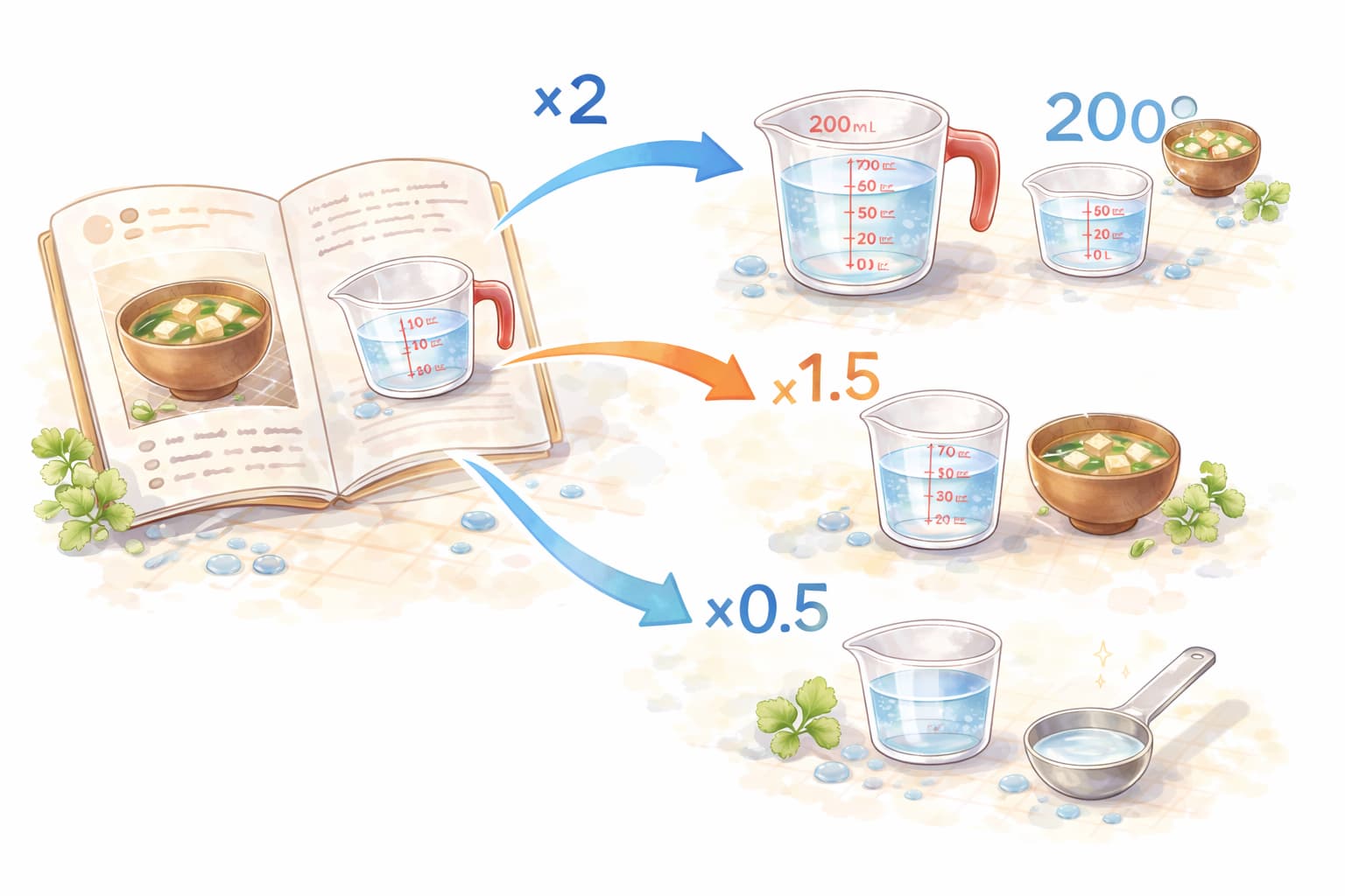 例えば80ccを1.5倍にするなら120cc、120ccを半量にするなら60ccといった具合に、まず「元の量×倍率」で考え、出てきた数字を計量カップやスプーン換算に当てはめます。
