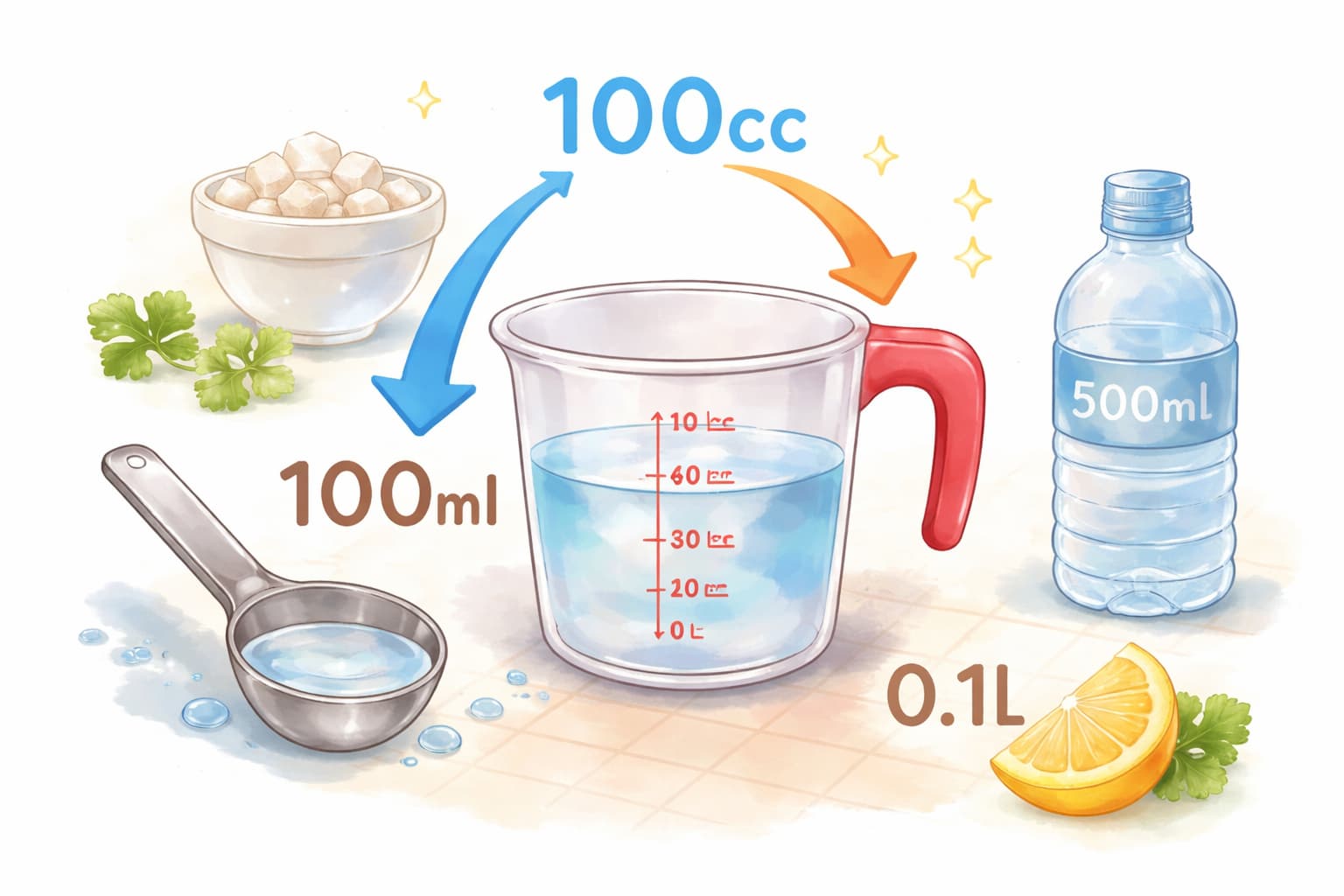 この記事では、100ccを一瞬で理解できる結論から始めて、料理での目安(大さじ・小さじ・カップ)、さらに液体・粉ものの重さの目安までを整理します。
