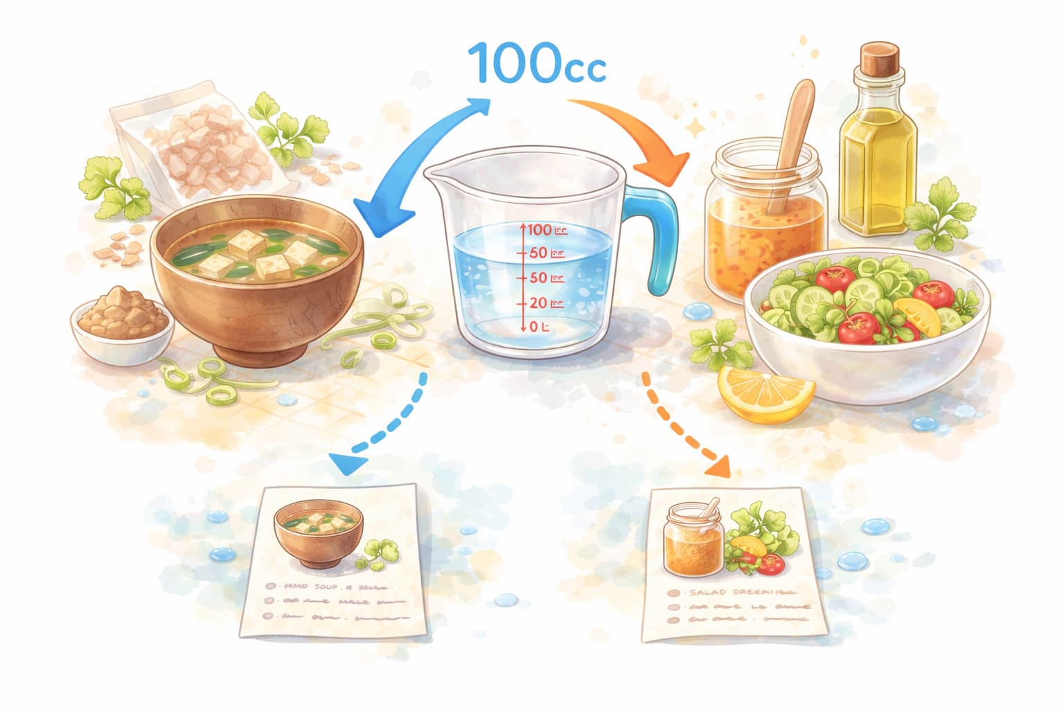 みそ汁のような汁物では、100ccは「一口分の増減単位」として扱いやすい量です。