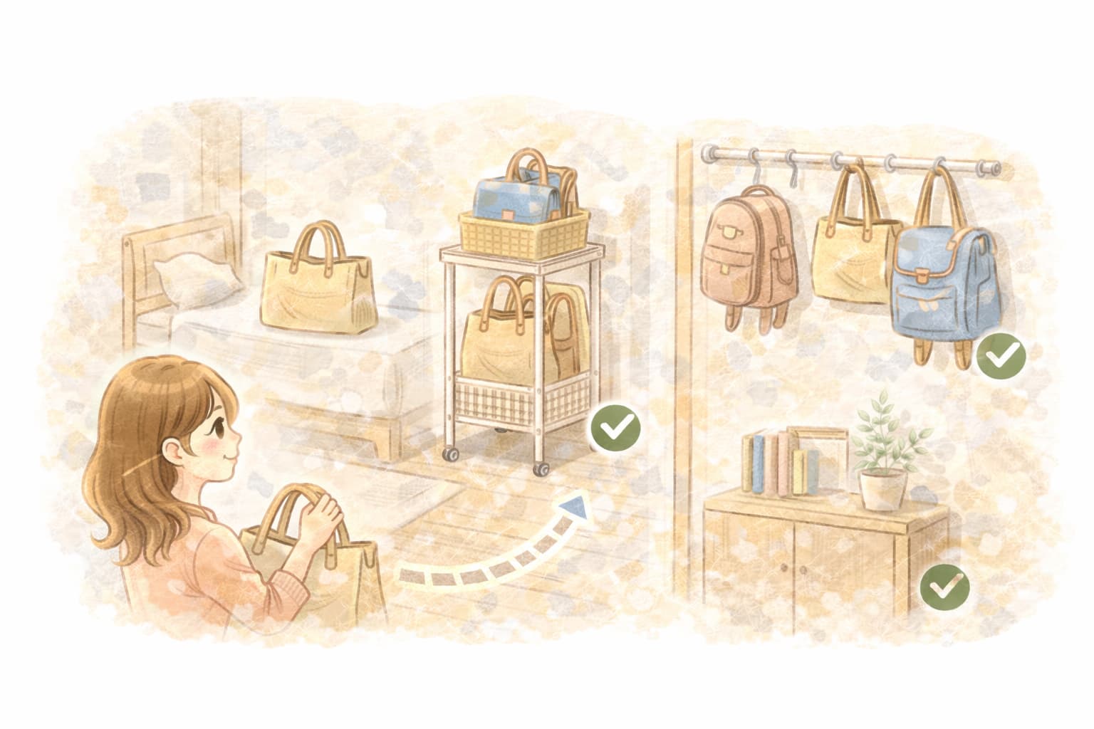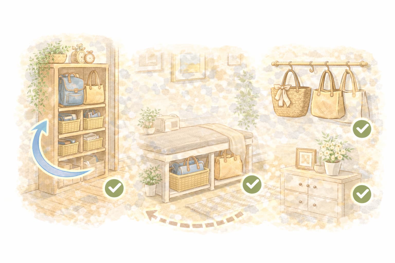 収納用品を置く前に、実際のバッグを置いたときの幅や奥行きまで見ておくと、後から窮屈になりにくくなります。