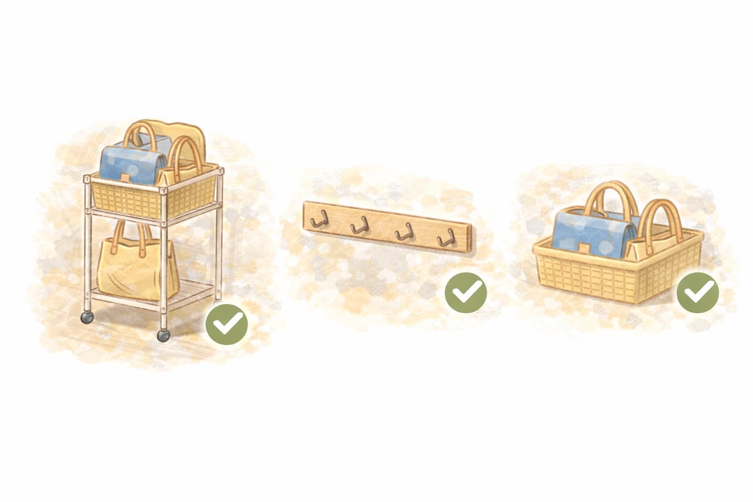 ショルダーバッグは比較的コンパクトなものが多く、フック収納や浅めの棚とも相性がよいです。