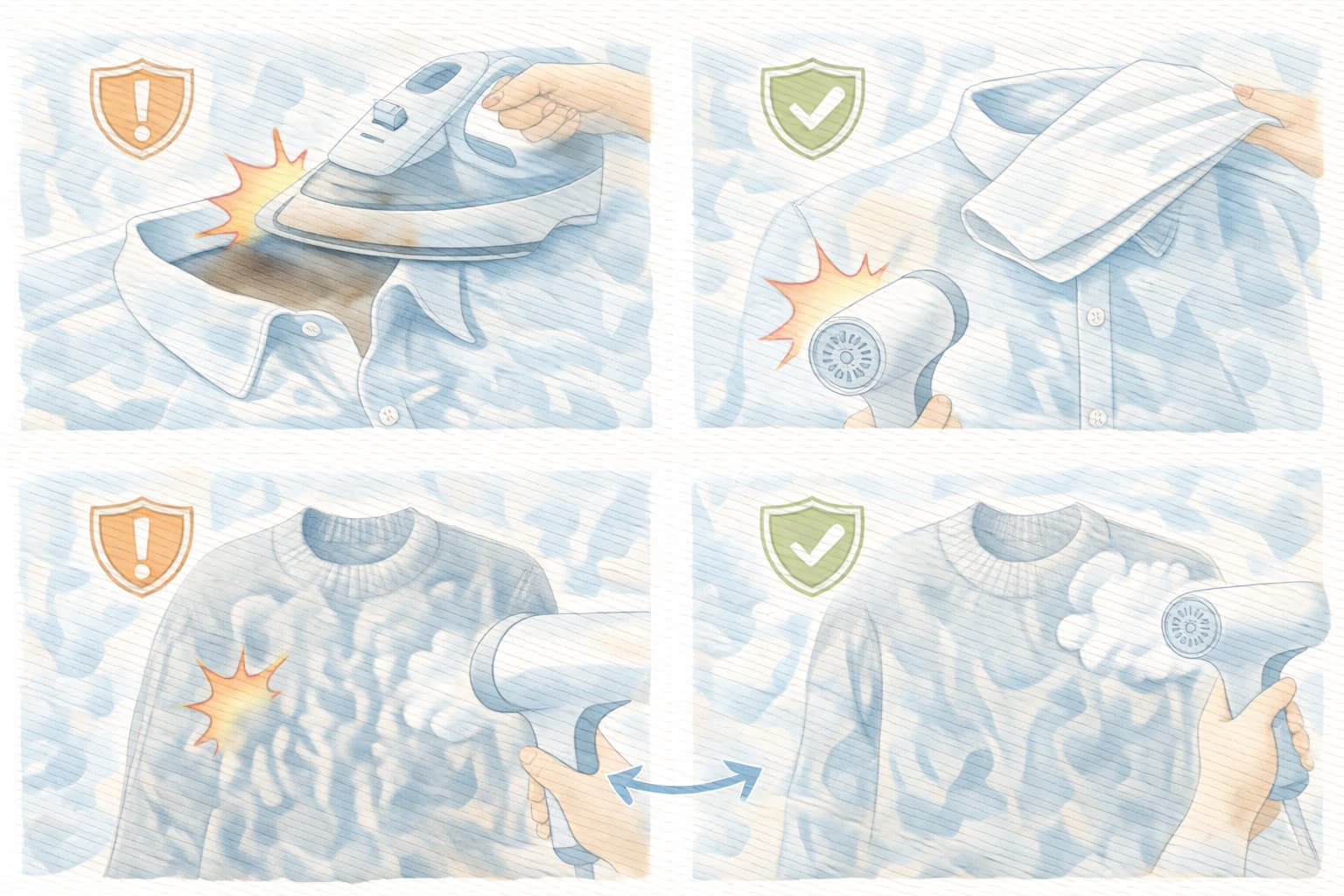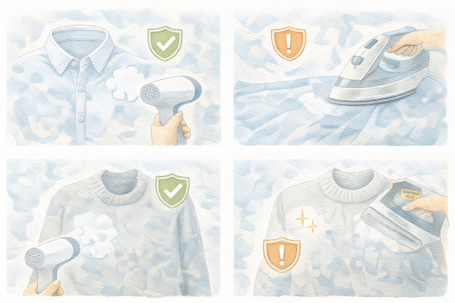 合成繊維や光沢素材は特に慎重に扱い、温風や蒸気も近づけすぎないようにします。