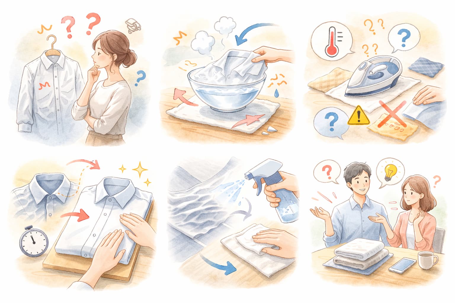 方法は多くありますが、まずは浴室の蒸気、霧吹きと干し直し、タオル押さえ、ドライヤーの順で安全側に試し、どうしても必要な場合だけ慎重に加熱系を検討すると整理しやすくなります。