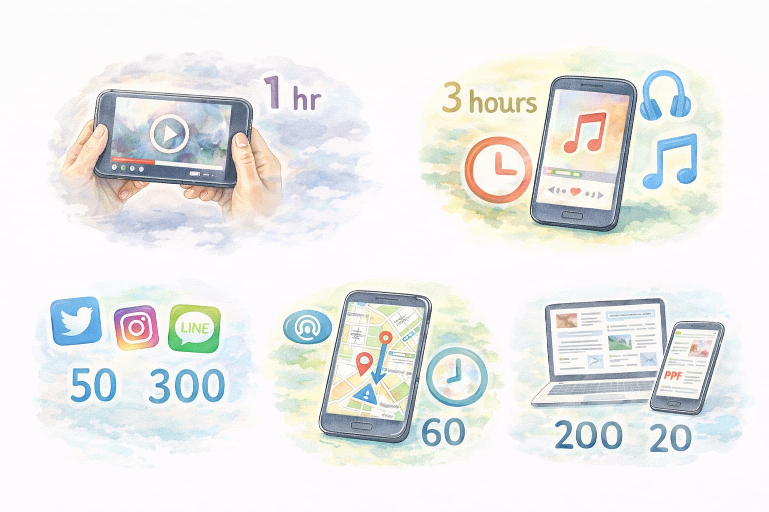 数字は端末やアプリ、画質や音質、広告の量などで変わるため、厳密な計算ではなく“体感の基準”として使ってください。