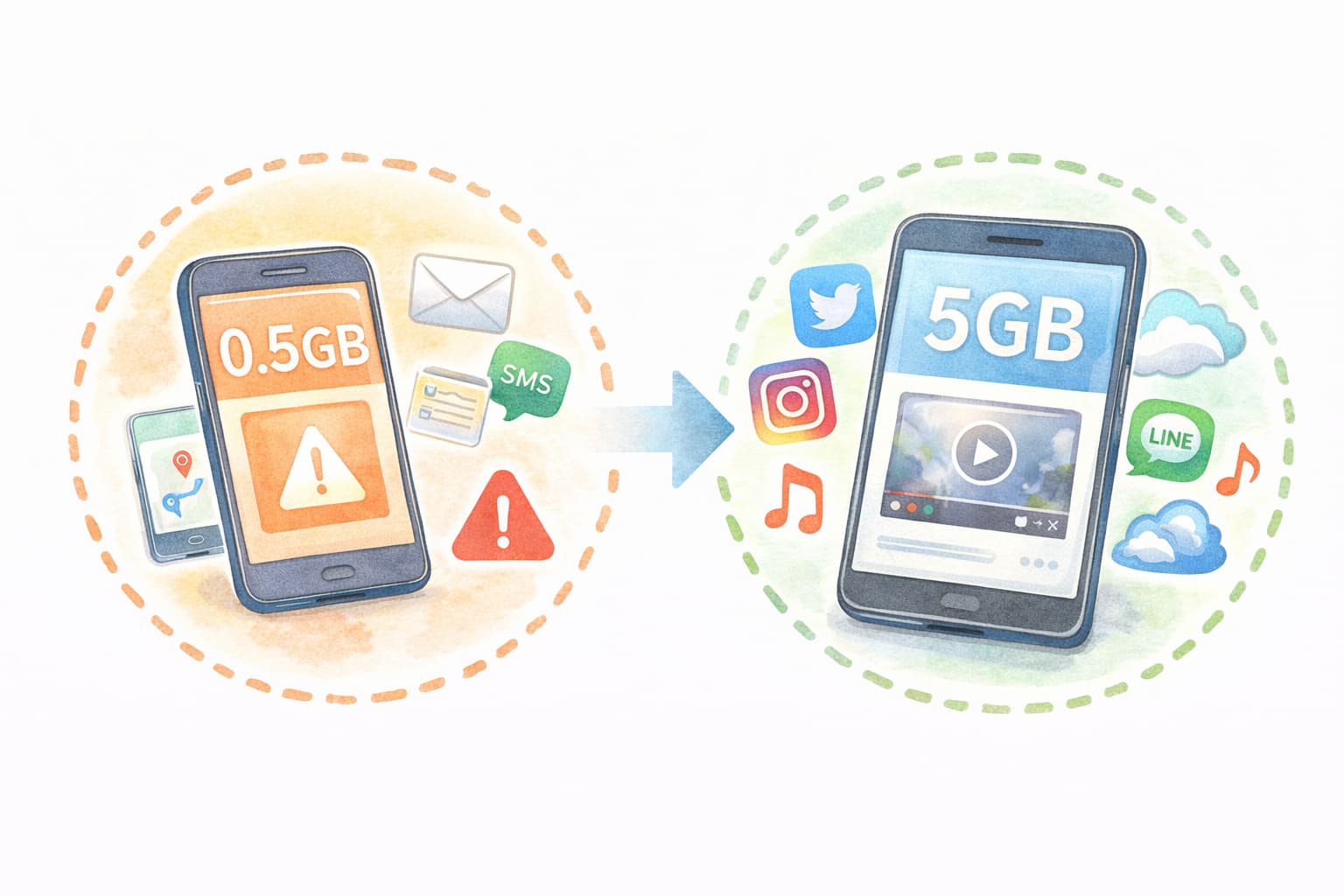 0.5GBは連絡や地図、必要な検索に絞れば成立することもありますが、動画視聴やSNSの動画が混ざると一気に破綻しやすい容量なので、使い方の設計が前提になります。