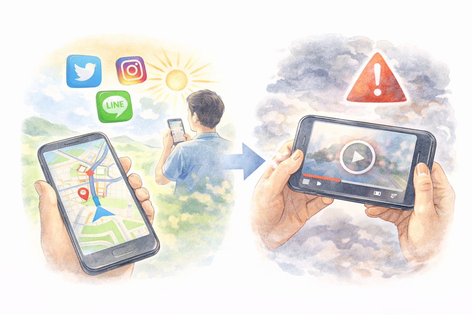 現実的には、地図のオフライン保存、必要な情報の事前保存、投稿はWi-Fiでまとめて行う、といった準備が効きます。
