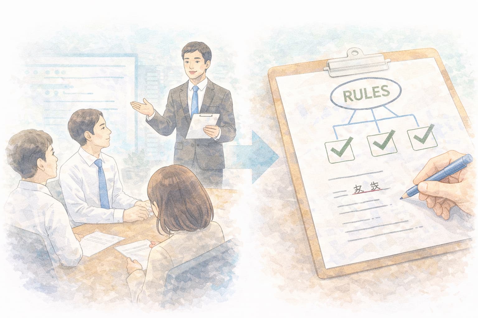 社内ルール化は大げさに見えますが、実際には「原則」と「例外」を短く決め、対象文書を整理するだけで運用が安定します。