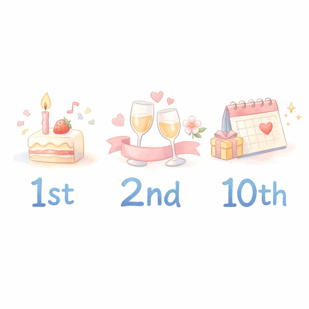 実際の表記では「1st anniversary」「2nd anniversary」「10th anniversary」のように、数字+序数+anniversaryの順で書くのが基本です。