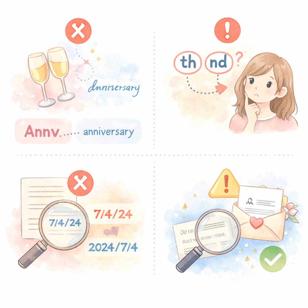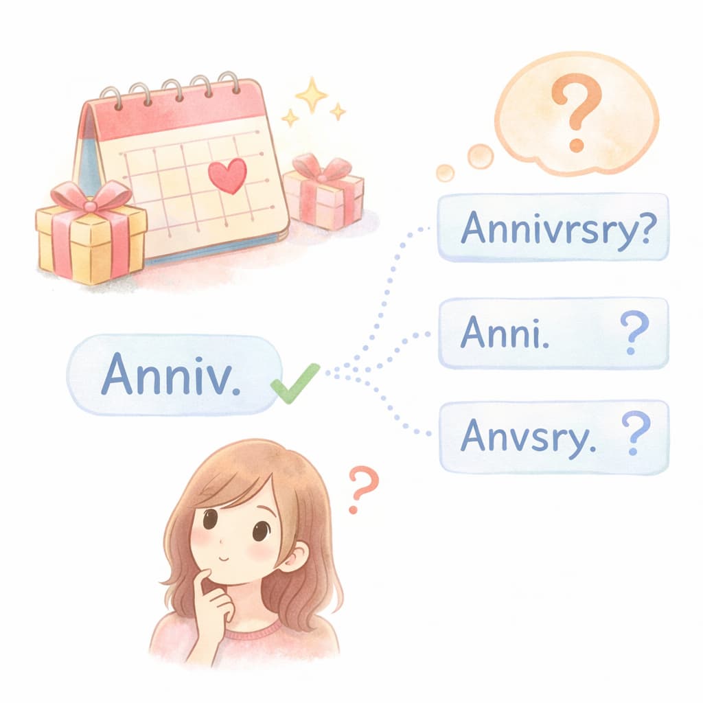 対策としては、1回目は「anniversary」とフルスペルで書き、2回目以降で略語を使うなど、バランスを取ることが効果的です。