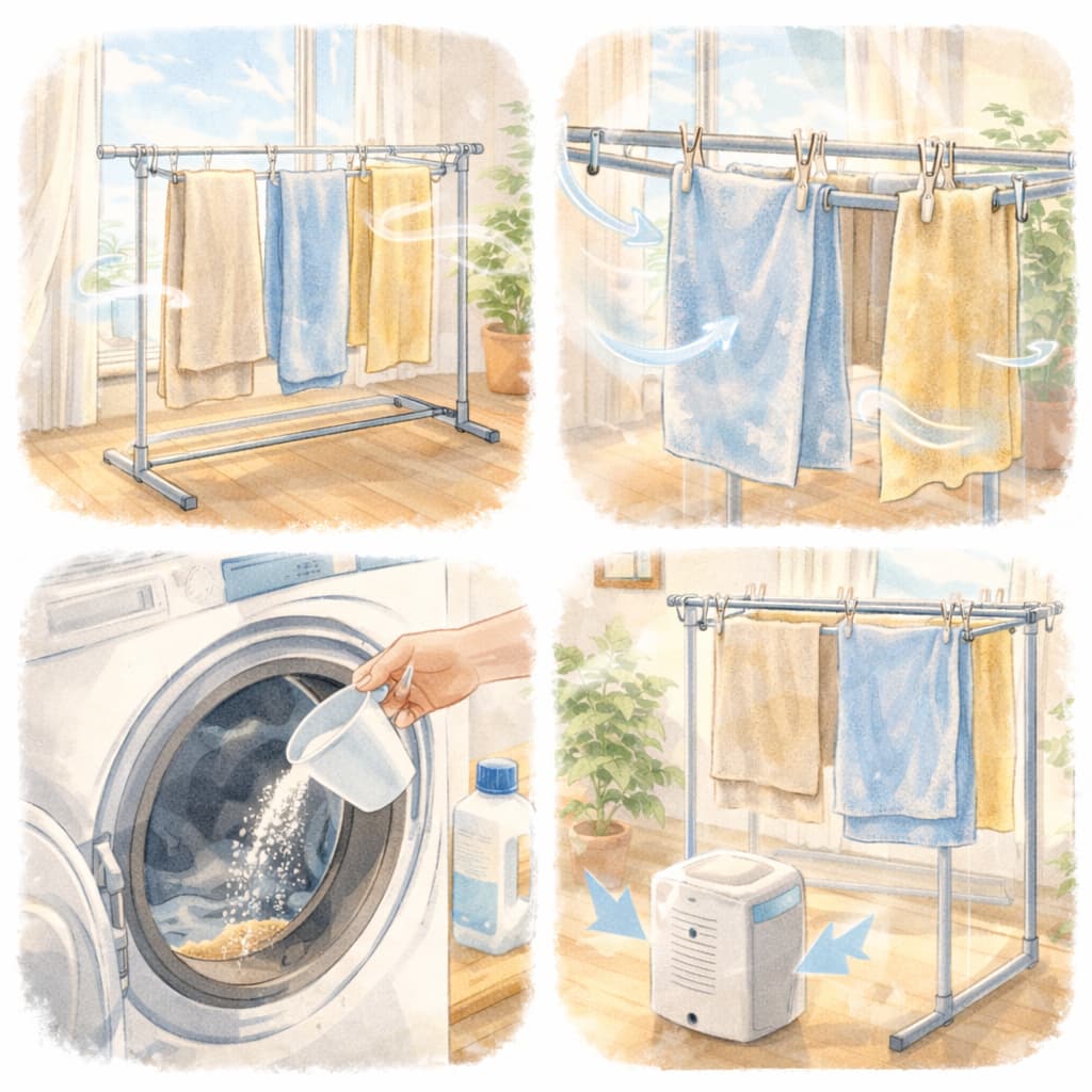 日中の明るい時間帯や、空気が動きやすいタイミングに干すだけでも乾きやすさは変わります。