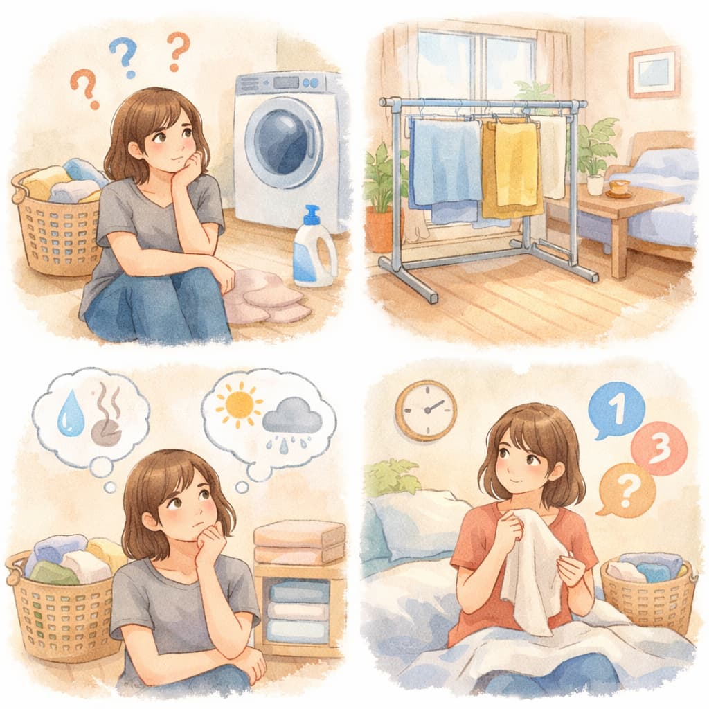 さらに、部屋の広さや干すスペース、生活リズムの違いなどが重なり、「どのくらいで洗うのがちょうどいいのか」が分かりにくくなります。