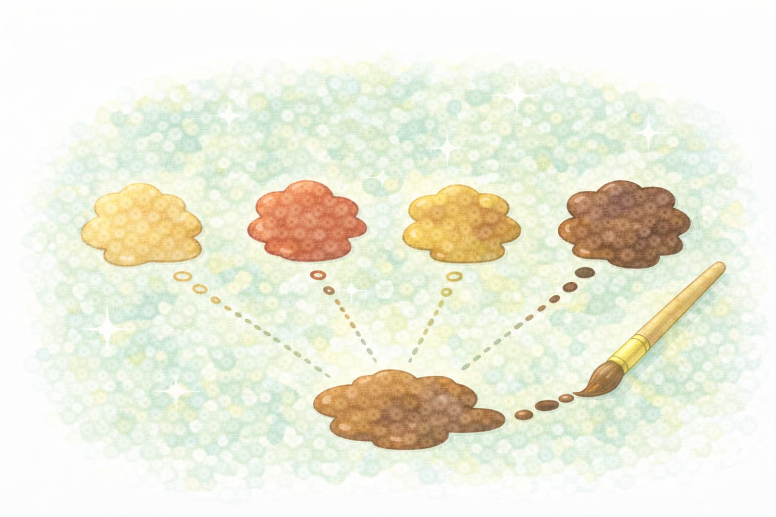 絵の具で茶色を作る基本は、赤、青、黄の三原色を少しずつ混ぜながら、目指す色味へ近づけていくことです。