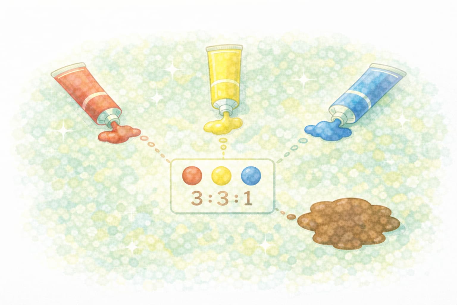 基本の茶色は、黄色をやや多めに、赤をそれに近い量、青を少し控えめに加える形から始めると作りやすいです。