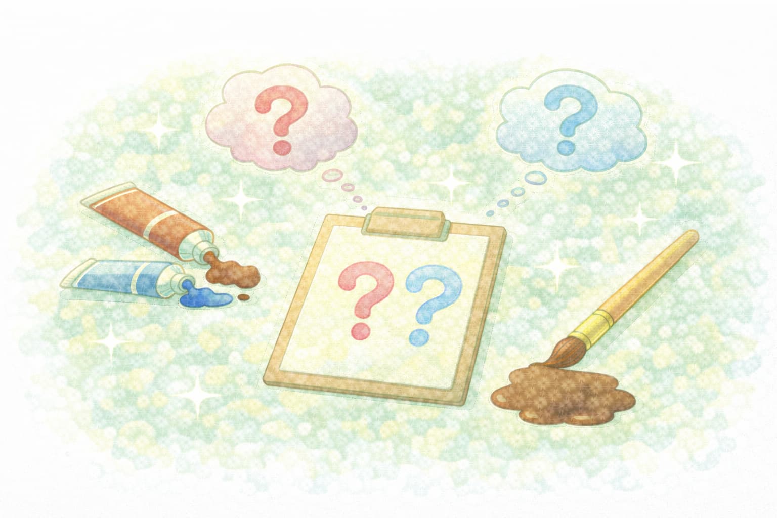 三原色だけで本当にできるのか、白を入れるとどうなるのか、黒は使わないほうがよいのかなど、混色を試している途中だからこそ迷うポイントがあります。