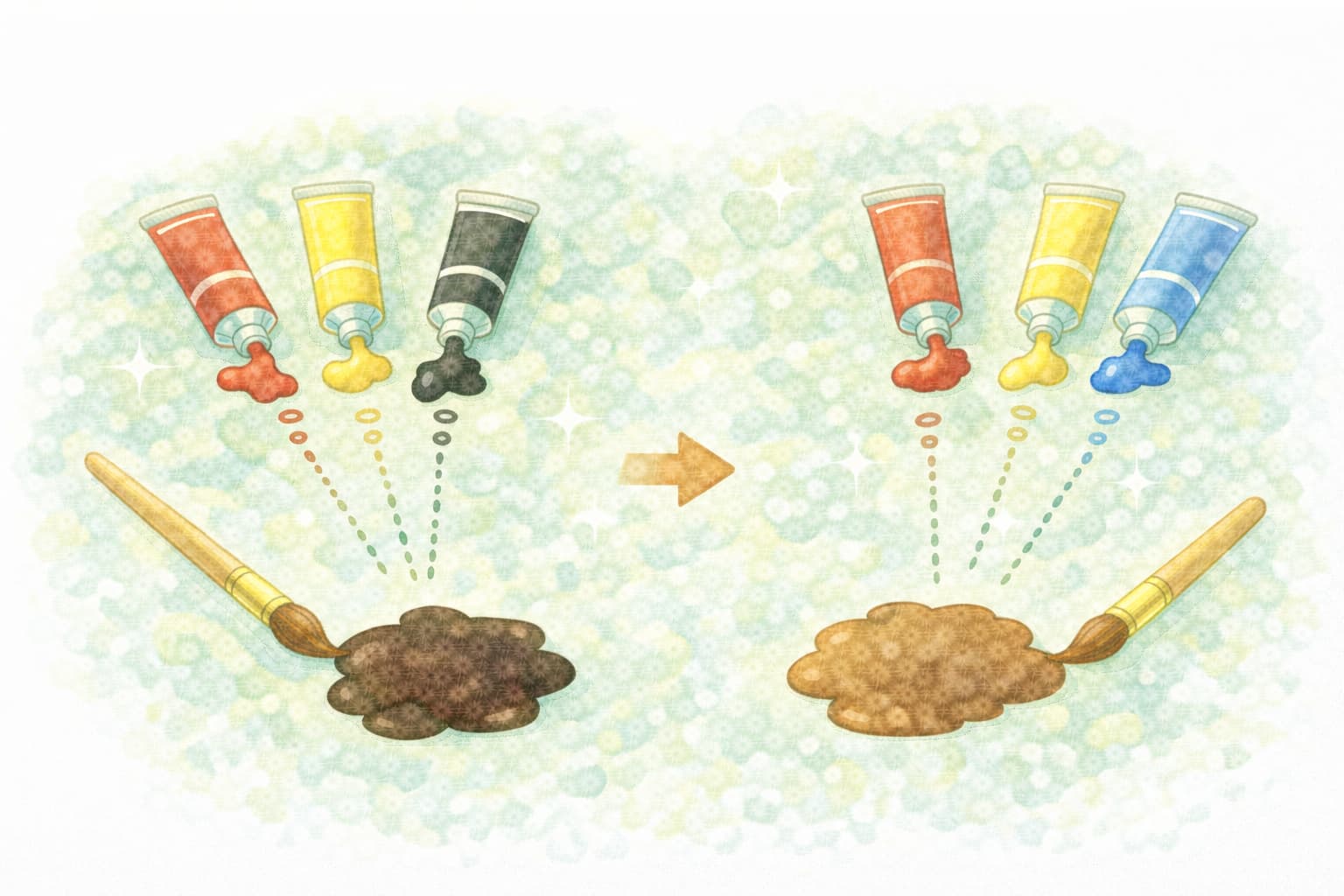 黒は便利ですが、入れすぎると濁りやすいため、まずは三原色中心で調整するほうが失敗しにくいです。