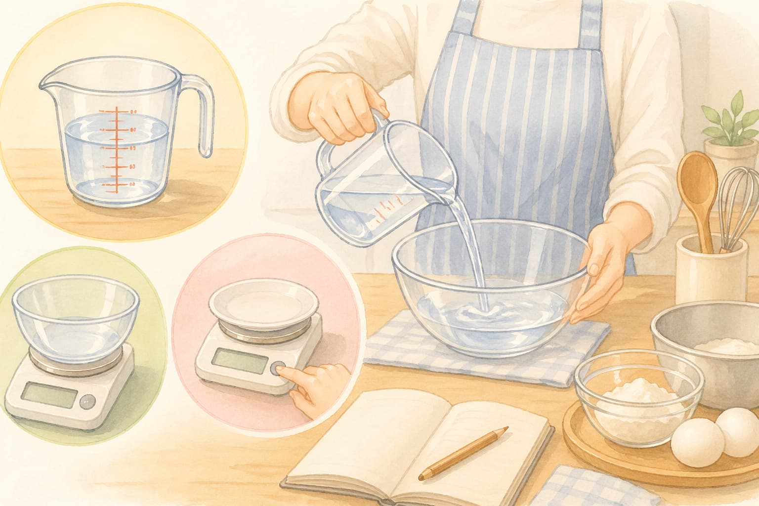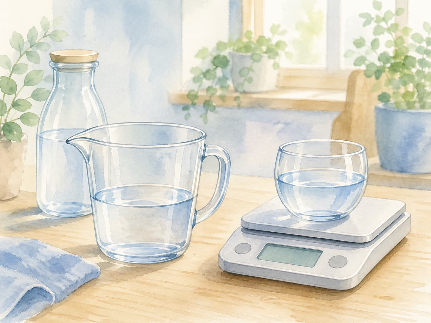 キッチンスケールで量る場合は、容器をのせた状態でゼロ表示にしてから水を入れると、水だけの重さを量れます。