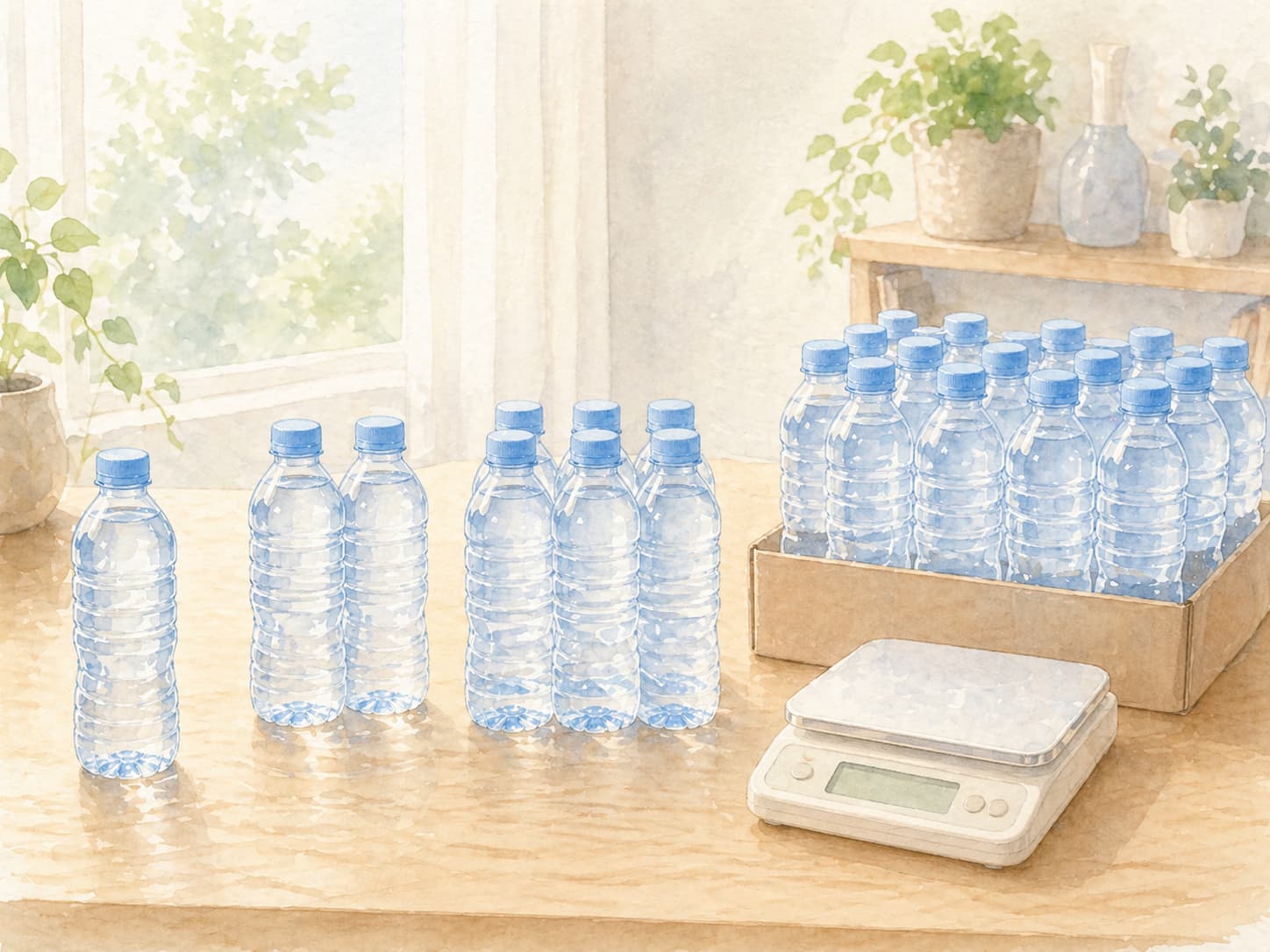 買い物や持ち運びの目安としては、500mlの水1本は約0.5kg、2本で約1kg、6本で約3kg、24本で約12kgと覚えておくと便利です。