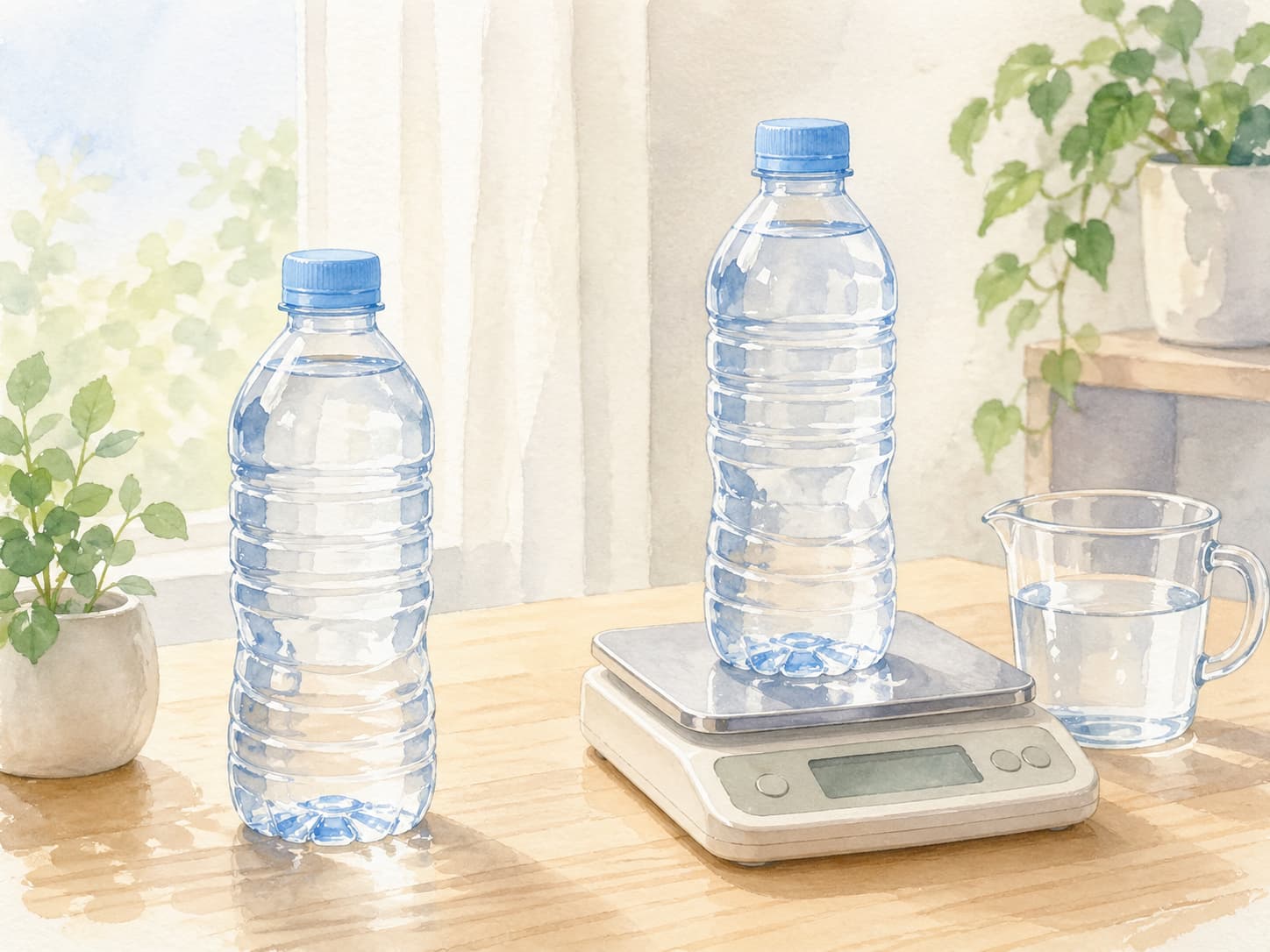 ただし、ペットボトル入りの水をそのまま持つ場合は、容器やキャップ、ラベルの重さが加わります。