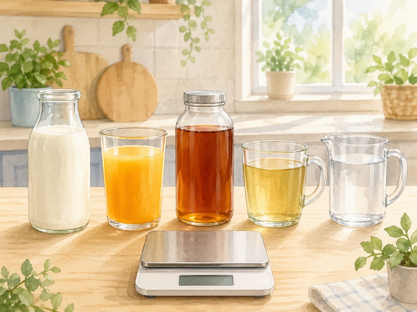 水以外の飲み物は成分や密度によって重さが少し変わるため、牛乳やジュース、油などを扱うときは水と完全に同じとは考えず、必要に応じてレシピや実測に合わせるのがおすすめです。