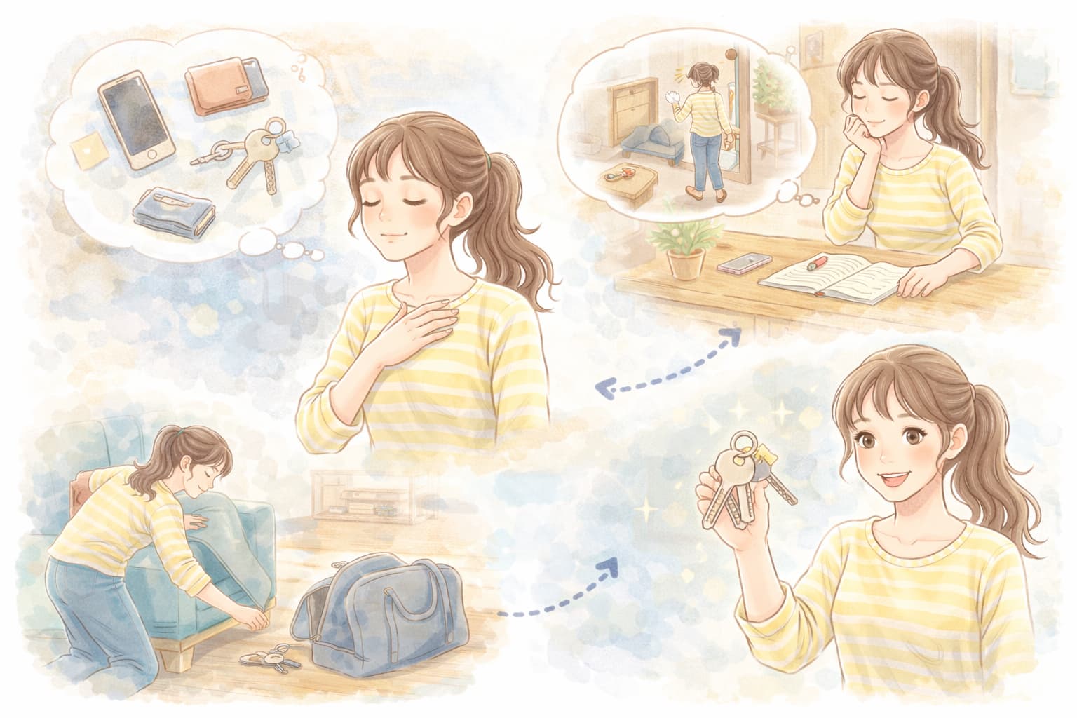 深呼吸をして気持ちを整え、最後に使った場面や動線を思い出すことで、冷静に探し直せるようになります。