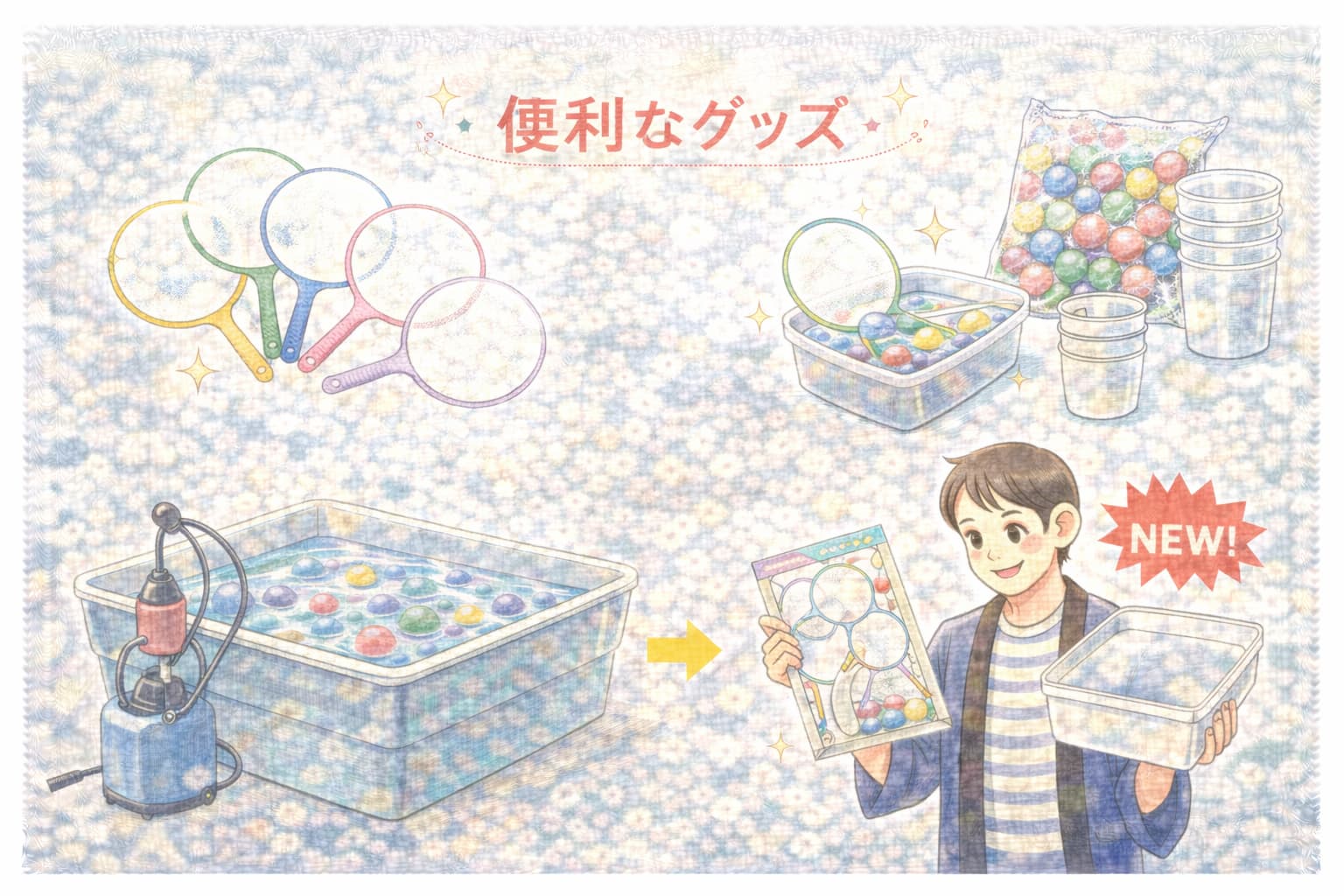 スーパーボールすくいは、夏祭りや地域のイベント、縁日などで見かける定番の屋台遊びのひとつです。