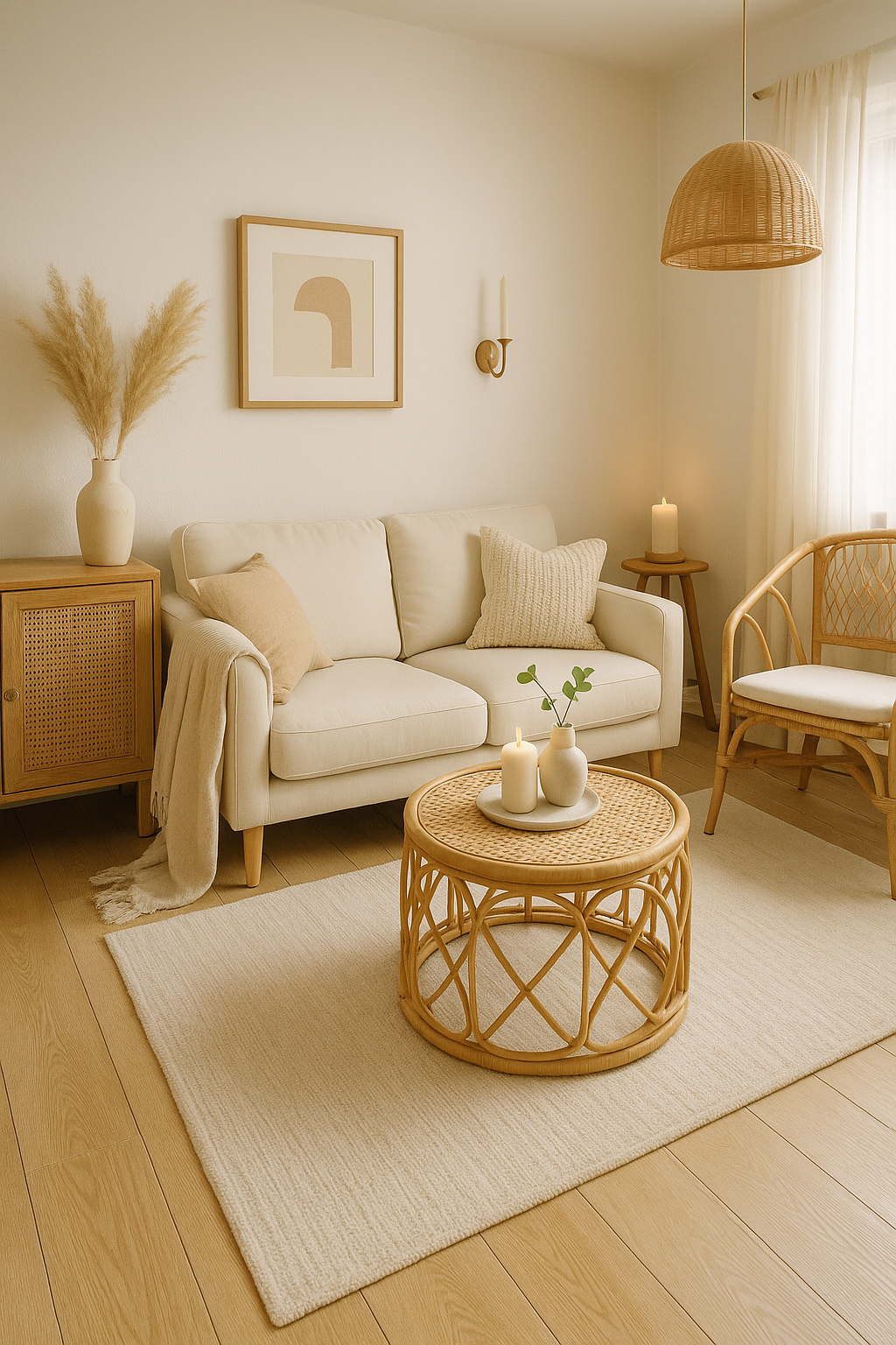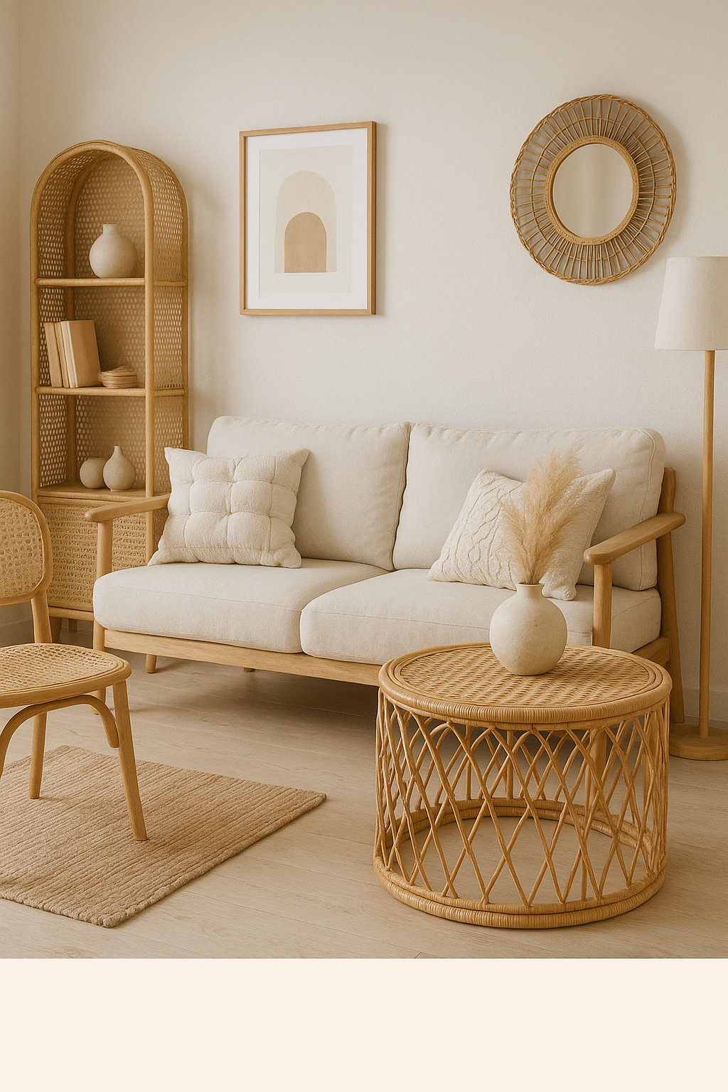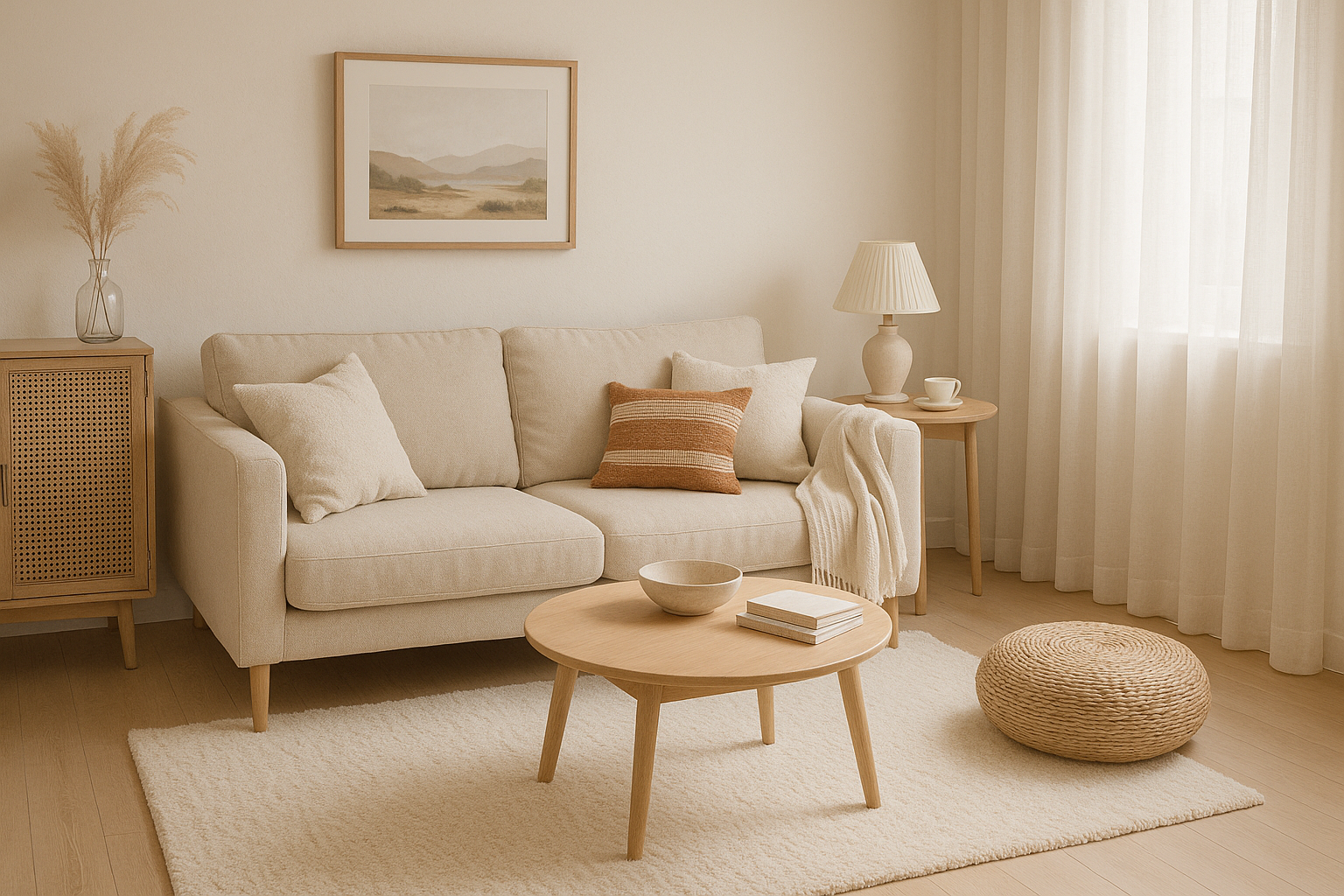 まずベースカラーをアイボリーやライトグレーなどのやわらかい色に統一し、そこに天然素材の家具や雑貨を加えていきましょう。