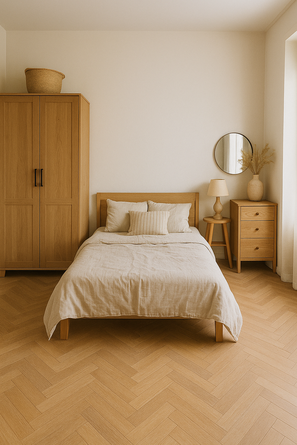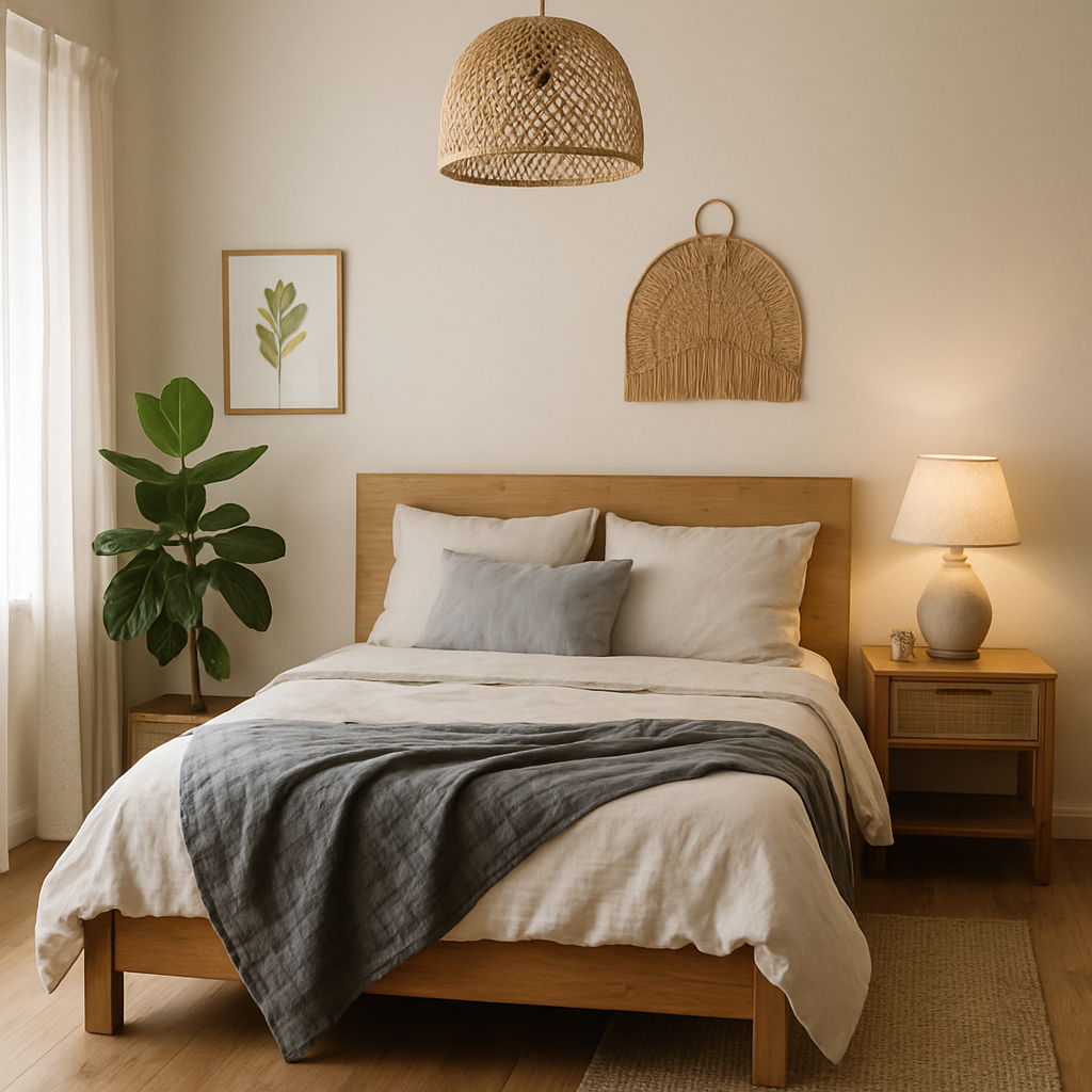 北欧スタイル:ホワイト×ウッドを基調とし、温かみのあるライトとシンプルな布地でまとめられた寝室。