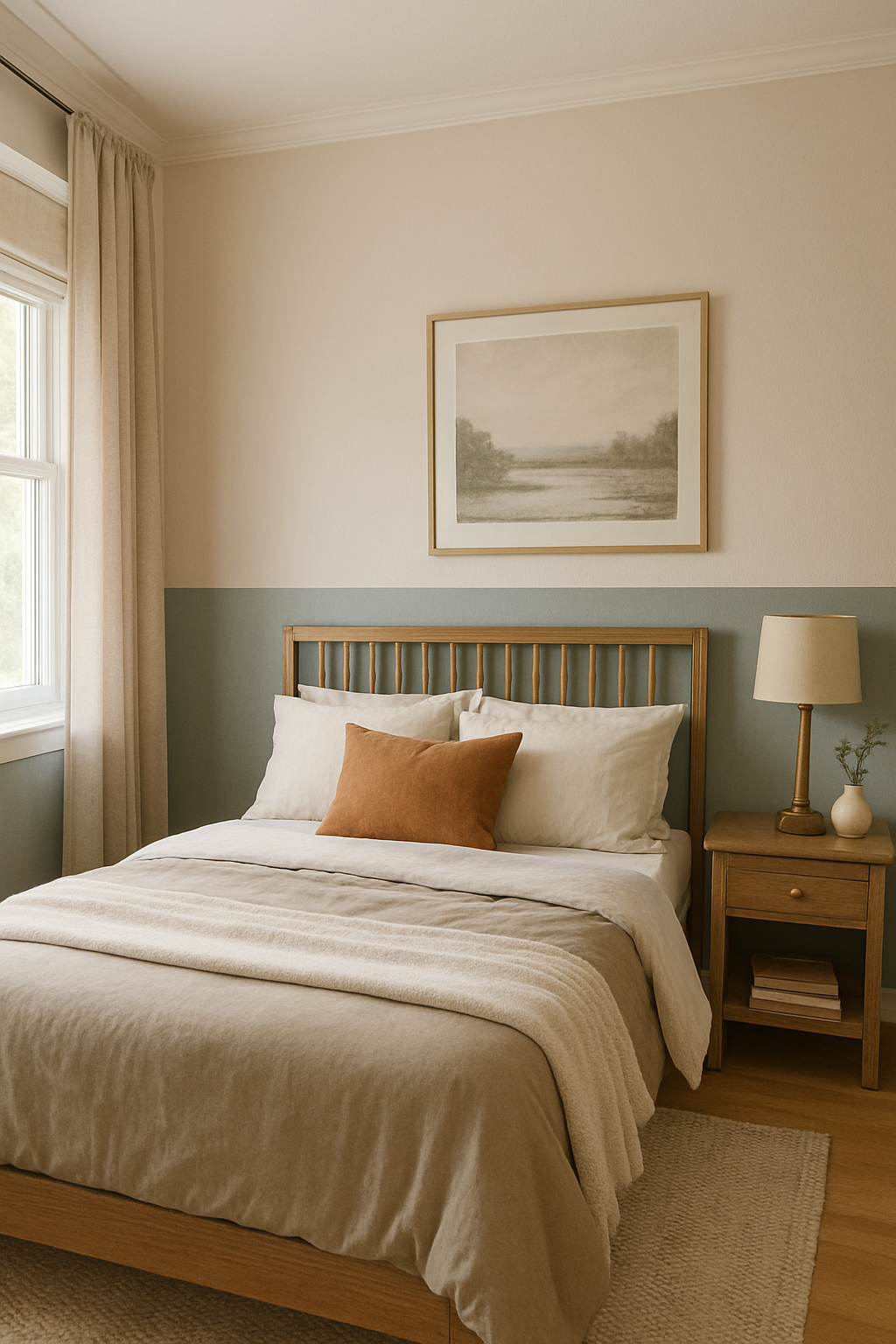 寝室では、強すぎる色よりも優しい中間色(ベージュ、グレー、スモーキーブルーなど)をベースにすると◎。