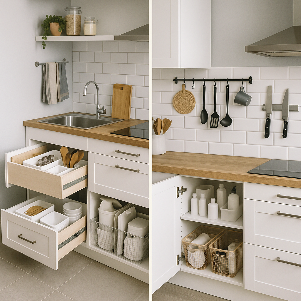 たとえば、引き出しの中に仕切りを設けて収納効率を上げたり、吊戸棚の下やシンク横のわずかな隙間を利用して収納スペースを増やしたりする方法があります。