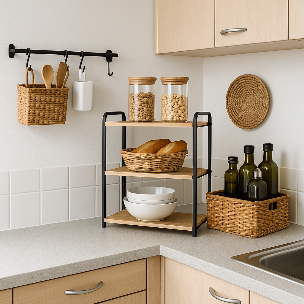 棚の上に設置して空間を二層にしたり、シンク横に置いて洗剤や布巾をまとめたりと、限られたスペースを立体的に活用するのに便利です。