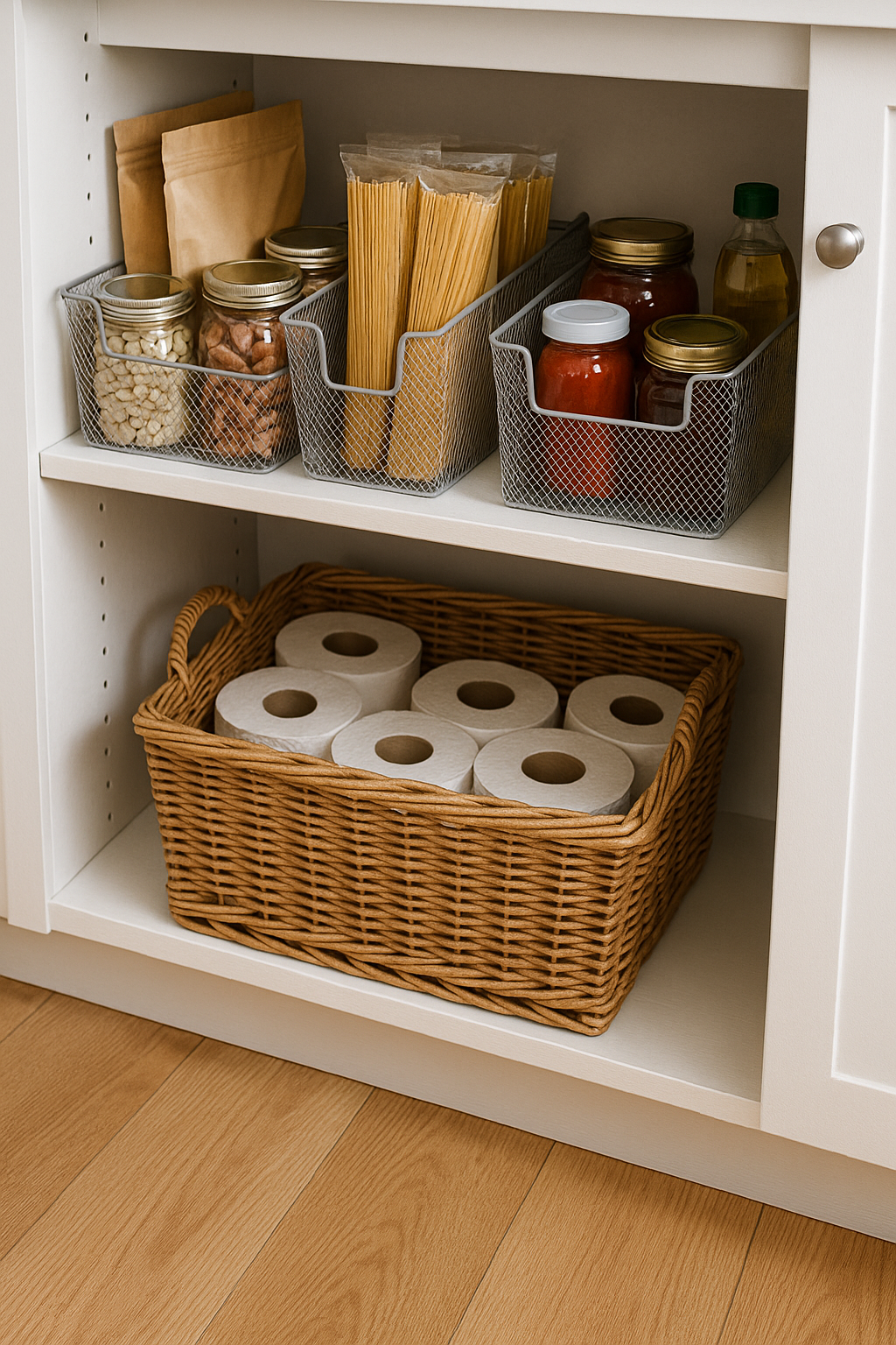 例えば、調味料やおやつ、ストック食材などを種類ごとにかごに分類し、ラベルを貼っておけば、家族みんなが迷わずに使えて整理も長続きします。