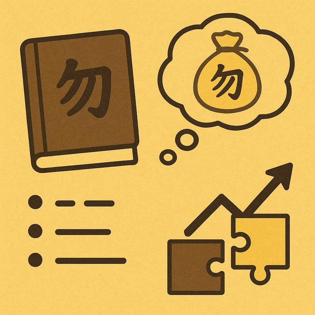 このように、「勿」は“何かを中にとどめる”という意味を軸にして考えると、関連する漢字を芋づる式に記憶できます。