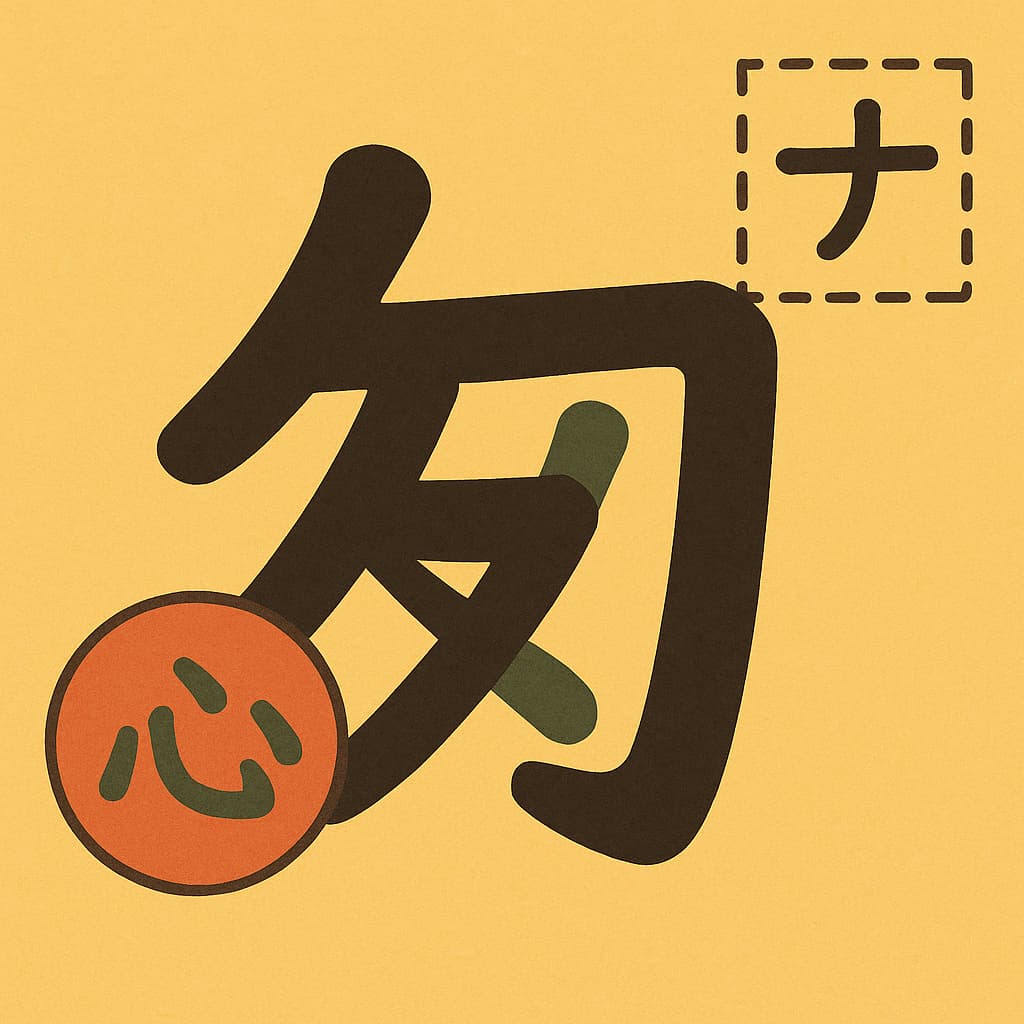 同じように、「忽(こつ/たちまち)」は、“思いが包まれて消えるように早い”という感覚を表し、「怱(そう)」は“心が急く”という意味をもっています。
