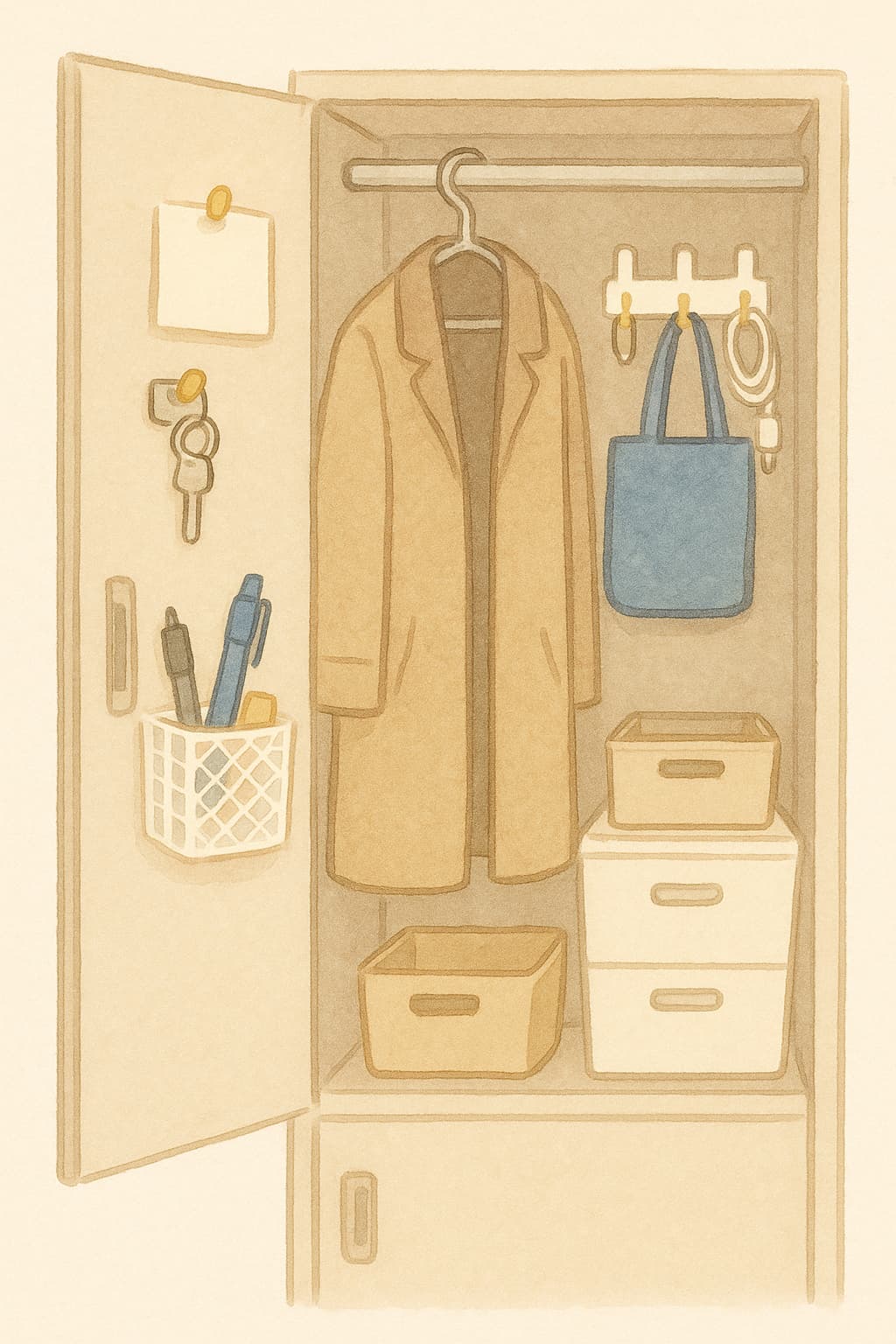 限られたロッカー内では、「縦に積む」か「扉裏を使う」ことでスペースを最大限に活かせます。